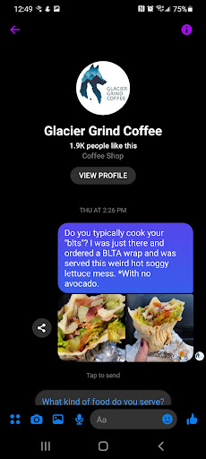 Ā Ā Ā Read moreI was so excited to find this place. Location is great and they have white coffee. The first few times I visited it was perfect. After yesterday's visit, it has been made clear that I need to find a new coffee shop. I am most disappointed in the lack of customer service or response to my concerns. I ordered lunch from there yesterday 11-4-21 around 2 pm. I had been awake since 4 am and this was my first meal. I was very hungry. I placed an order for a BLTA wrap, same thing I ordered previously. This time I was really confused. They handed me my food wrapped in tin foil and it was hot. I thought maybe they mixed my order up or didn't hear the driver. Nope. I bite into a hot tortilla filled with soggy bacon & warm wilted slimey lettuce colored by bits of tomato, and I never found avocado. I was taught to not waste food and I was hungry. I had 2 bites into this with the slimey lettuce sticking to my teeth and I couldn't handle it. It was incredibly gross and I had throw it away. I get that mistakes happen, especially with new people. Again, I am most disappointed in the lack of response or communication from Glacier...