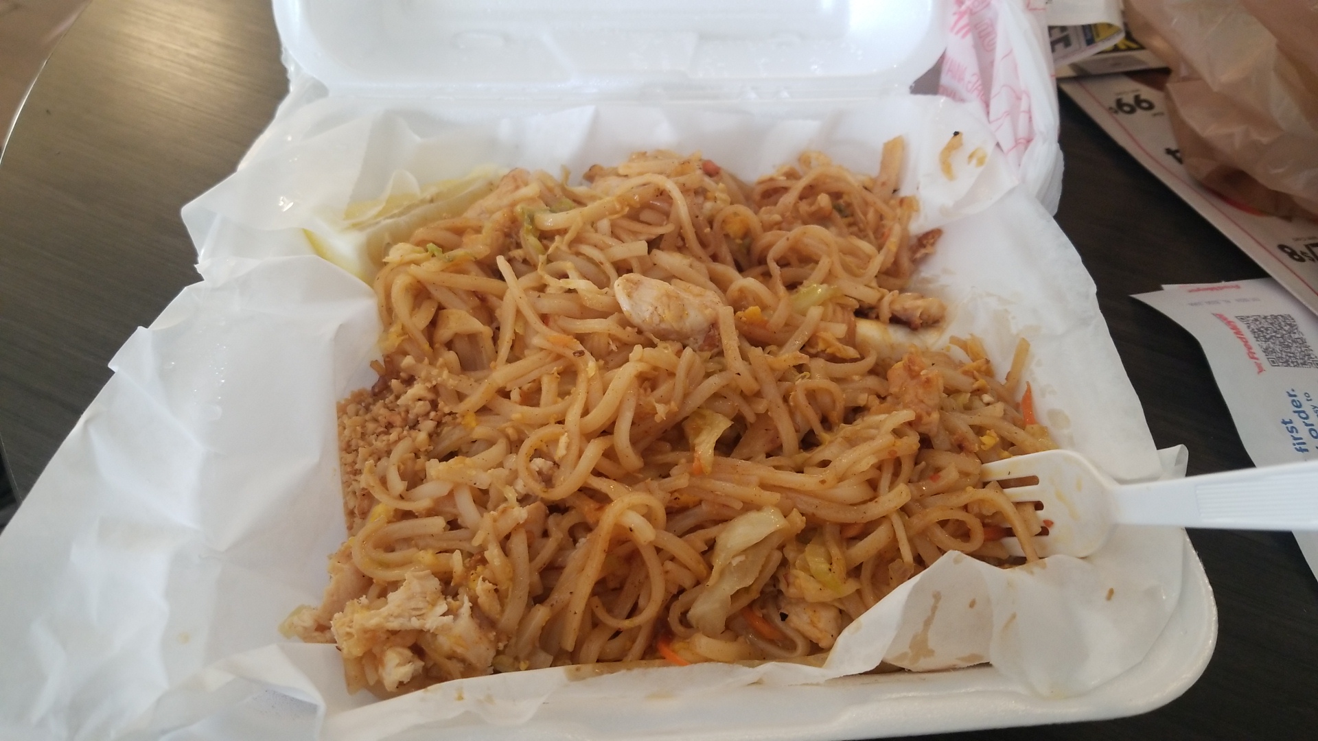 Read moreThis is perfectly mediocre. The egg rolls were badly burnt and the "pad thai" I got barely resembled this amazing thai dish. It had 3 cabbage leaves, questionable purple splotches, no real vegetables, and the sauce was more of a tamarind and vinegar sauce than anything to do with real pad thai sauce. The chicken had 0 seasoning and was fried with oil so it was rubbery and bland. So I got a pound of noodles thay were so gross I threw them away and egg rolls so burnt one small bite had me tossing them too all for $17. The only edible thing was my diet coke. Definitely...