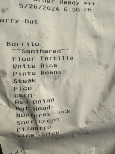 I placed my order online at about 6 PM and the status said to give them 20 minutes… fine by me! I went through Starbucks next door to kill time and got gas before picking it up at about 6:30. When I got there, BENEFIT OF THE DOUBT, I walked into a small rush so I waited in line for another 10 minutes to get my food and by the time it was my turn, I said I had a to go order. They hadn’t even touched the receipt. I ordered 2 smothered burritos and the worker was actually very pleasant at that time and mentioned they had an accident with the queso so they needed another 10 minutes.. still, fine by me! I told her I was gonna run to Kroger to get something while I waited and that’s just what I did.