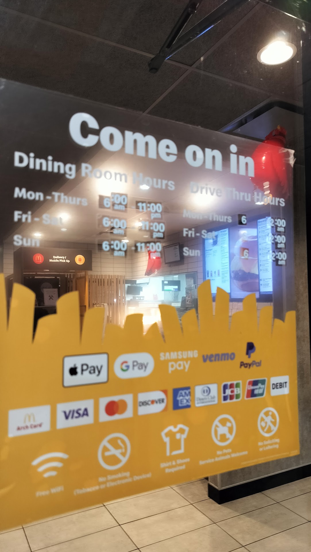 Read moreWay to shine, McDonald's. My brother, cousin and I stopped in for a visit after an extremely difficult day thinking at least McDonald's will cheer us up. A little mickey ds USUALLY cheers ya up. Well we parked, exhausted we get out of the car walk up to the locked door and with some befuddlement see a couple of the managers sitting at the lobby tables, watching TV, clearly relaxing and enjoying themselves (which is exactly what WE were hoping to join them in doing). I thought it must be later than I realized so I checked my watch - it was 9:54. Looked at the door again, sign said it was open in the lobby till 11:00 PM Monday thru Thursday. This is Wednesday, so I make eye contact with the two ladies sitting there who have now started to get up like we disturbed them. We said loudly "hey it's only 10, what's the deal?!" One of them rolled their eyes as if she were dealing with some special needs person that she just couldn't be bothered with and the two of them made their way to the counter, then behind the counter, then to the recesses of the store where I assume they went to do manager stuff. Which does not include, apparently, helping customers or the staff on hand help the customers. Or even take care of the little things, the details managers are supposed to be trained to take care of. Petty things like hours of operation didnt matter to them, nor my hungry belly, and my now sunken heart as we walked back to our car and drove away empty handed. It looked like the drive thru may have still been working, but after what we just went through, could you really blame us for heading on over to the competition who were, if you were wondering, not only open and doing a brisk trade, but were glad to see us and happy to whip us up some great food at a reasonable price, and within a very short amount of time. Imagine! Way to go...