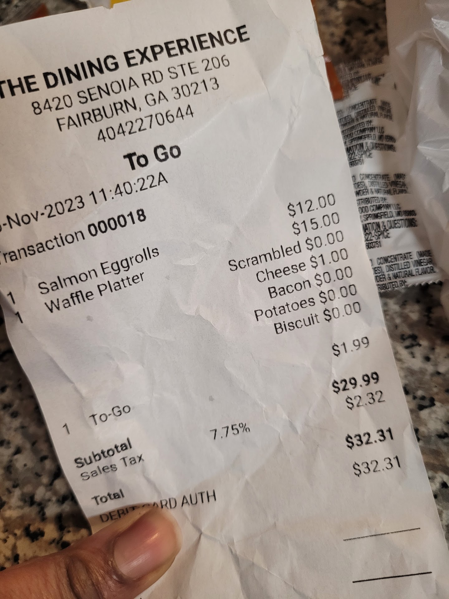 I ate only one of the dried out over fried croquettes! The cheese in my grits wasn’t melted and the breakfast potatoes had no salt or seasoning on them.
