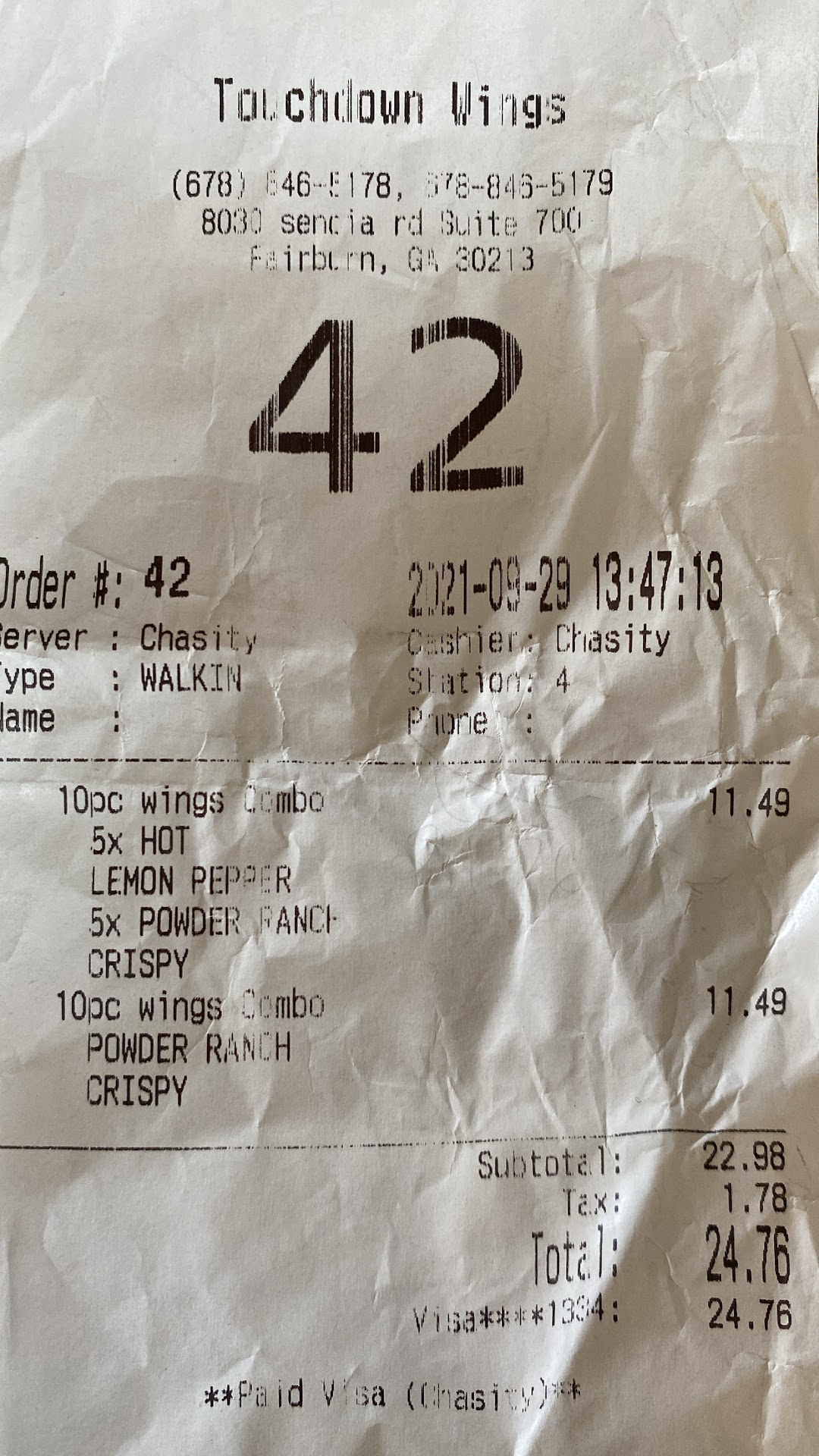 I have gotten take out multiple times in the past, so I didn't think the quality of the food would be any different from past experiences. I ordered a 50 piece wing combo, 20 medium hot and 30 lemon pepper. When I say these were the worst wings EVER...I mean EVER! The lemon pepper wings tasted like old chicken that had been sitting around, then re-dropped in the fryer to make them hot. Both flavors looked and tasted like the chicken had a disease. Every piece was pink, brown or black down to the bone. At one point, I thought that maybe they tried to cook this order from frozen/unthawed pieces. Needless to say, I had to throw away the chicken, and we had to go get something else to eat. I don't know how customer service would have worked out. I didn't contact the restaurant. We were so disappointed and still hungry that our main thought was to get some other food. I won't return to this particular touchdown wings. The quality of the food has gradually gone down since I started frequenting them over the past few years. I stopped going as often, but now I'm done. I guess I'll start back going to the American deli across the street from Greenbriar mall whenever I want some wings in the future...I'm almost...
