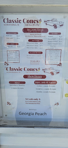 This is a great small town experience. Friendly people, Lisa and Gloria make you feel like they've known you forever. They have some fantastic soft serve ice cream, malts are excellent ! They'll make you a Banana Split "Your Way" if you feel like not going traditional. If you find yourself in the vicinity of Fairbury Nebraska, do yourself a favor and stop by Classic Cones for a delicious treat. Better hurry as they close for the season after...