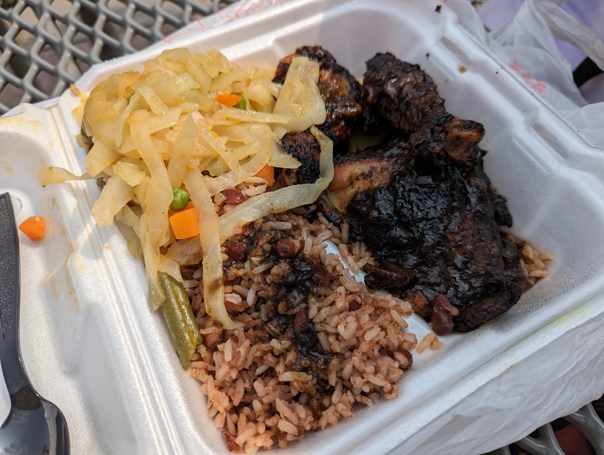 If you're new to the cuisine, you can't miss with the jerk chicken or a beef patty (pictured below). Neither are too spicy or expensive. Most dishes come with rice and beans on the side. The oxtail and curry goat, as well as the stewed options, are equally tasty, but be aware most dishes are served bone-in. I recommend you try everything at least once, and if they ask if you want your side dish to come with cabbage, say yes. It's good and you'll thank yourself if you paired it with something spicy. The plantains are good too, but sometimes they won't be available due to supply issues.