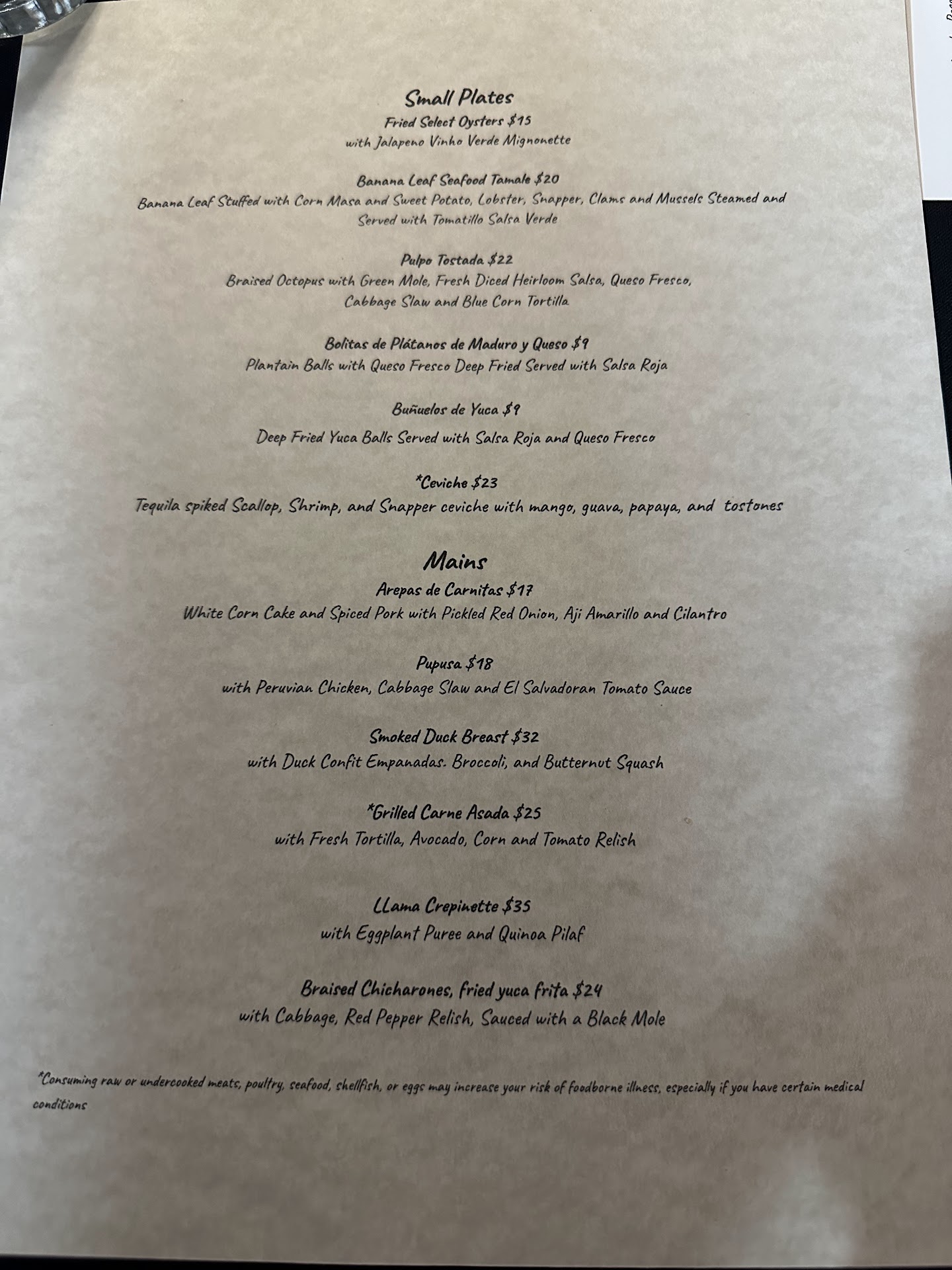 Value: this is why we probably will not return. The drinks were small and full of ice (Pisco sour was 3/4 egg whites), despite being $12-14. The appetizer really needed one more plantain ball for $9. And the entrees seemed very overpriced. To add to pain, there was a cash vs credit total on the bill with 3% added to the credit. We don’t mind spending money for a good meal, but the value wasn’t there with the food and the credit charge was kind of insulting on the end.
