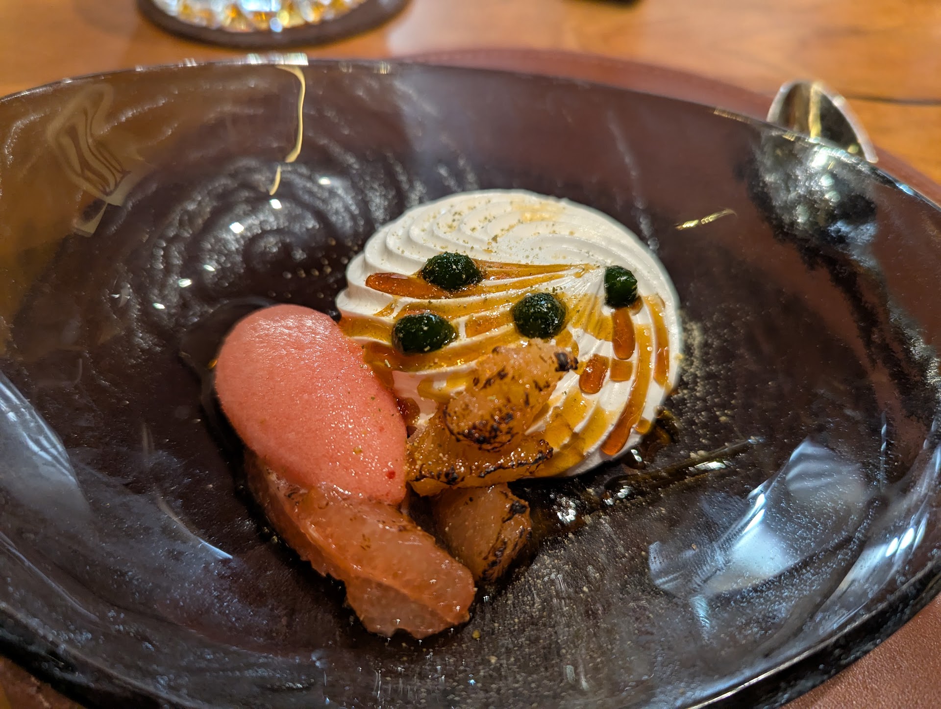 We began our meal with the heirloom tomato and strawberry gazpacho, which was a refreshing and vibrant welcome dish, all freshly prepared and hand cut by the chef. For the first course, we opted for the spice-seared rare Pacific hamachi with chilled lobster emulsion, roe, and burnt orange. The flavors were perfectly balanced, and the hamachi was exquisitely fresh.