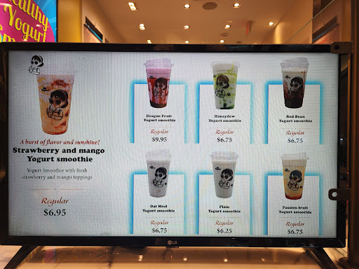 This spot is BOMB!! My boyfriend and I stopped in here a couple days ago around 35 min before closing (located on the upper floor by Forever 21 and Macy's) and were blown away by the quality of the drinks here. They specialize in fruit-flavored yogurt-forward drinks but also offer boba and some coffees. I was impressed by the selection of flavors they offered such as dragon fruit, blueberry, and green apple. I ordered a strawberry-mango yogurt drink, and my partner got a taro boba drink. I will say it was a bit strange that you had to order a large if you wanted boba included in your drink and also that they were not able to change the ice level of your drink. Also, the prices are pretty high - i paid about $16 for one medium drink and one large drink.