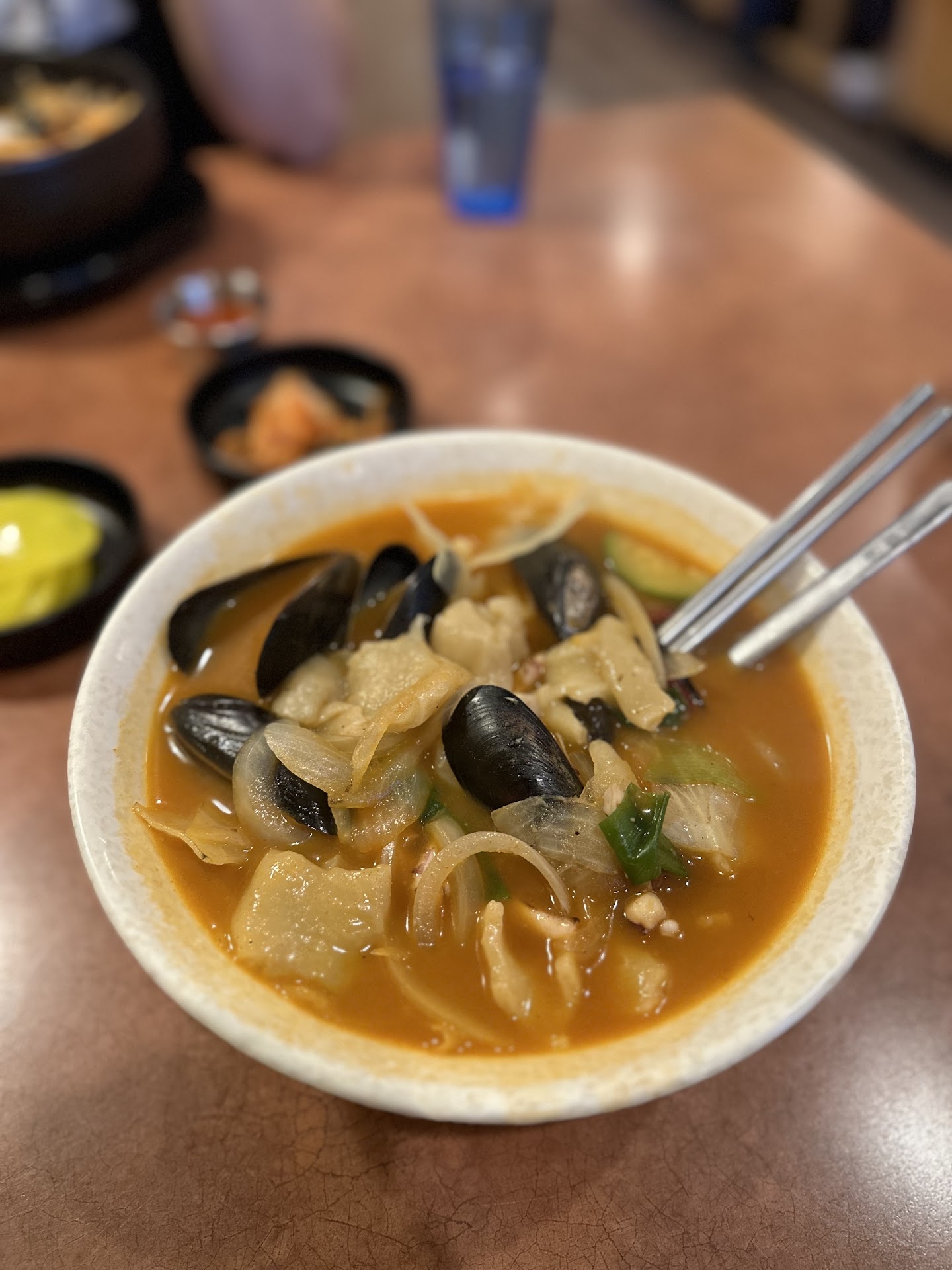 The Food: For my main entree, I went with the Jjambbong Soojaebi. My friend had the Bibimbap as well. We shared a Spicy Tuna Kimbap and a Beef Kimbap as well. The Jjambbong Soojaebi was absolutely delicious! The spicy broth and the seafood in it were cooked perfectly, and the hand torn noodles were cooked nicely as well. The whole soup is nicely portioned and well worth it. Flavor was on point! As for the Kimbap, each roll was packed with it's fillings and tasted incredible. Quality food here.