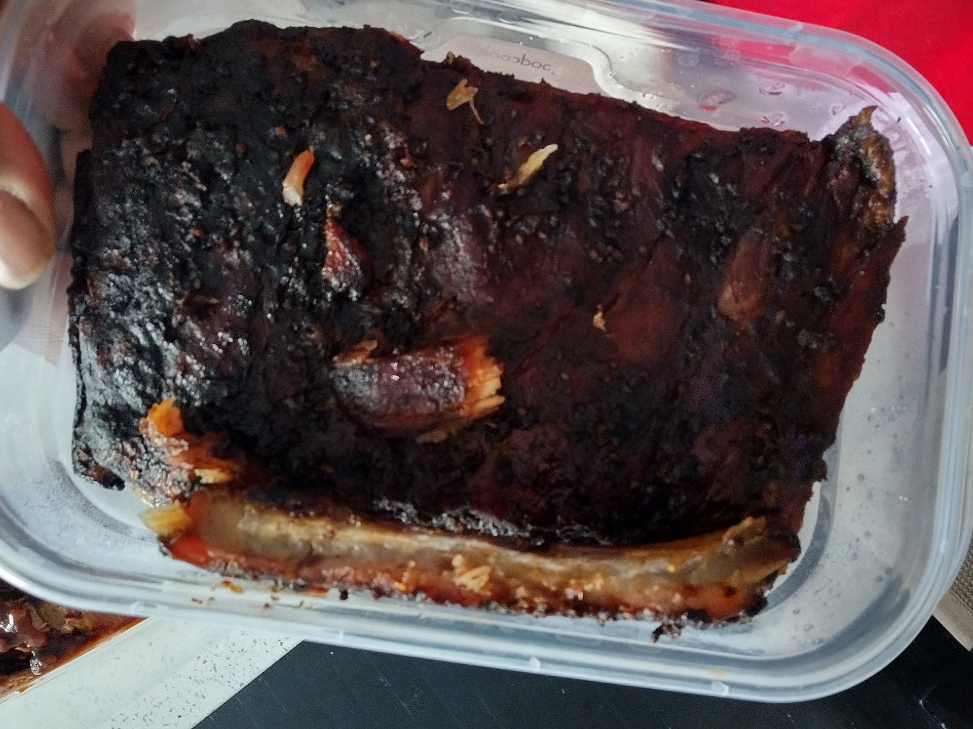 The ribs were partially edible; almost as if one end of the slab cooked unevenly and so one side was tougher than the other end.