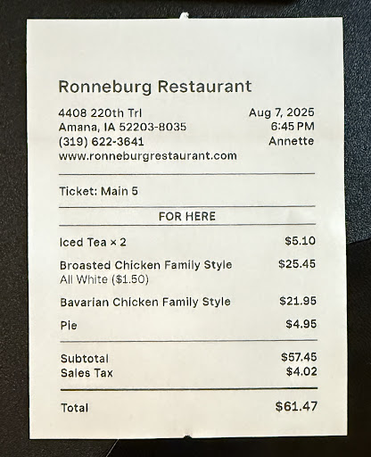 This past weekend we visited the Ronneburg again. As stated above, sometimes the service is iffy. We have had great service lately when we have visited, but not so much this past weekend. Oh, the guy tried to be friendly by telling us how much he liked the food we were ordering and so on. I got the Amana Poutine, which he highly recommended. I probably won't get it again. It was probably the most underwhelming thing I've ever gotten there. My wife, however, got a fish dish (sorry, I don't recall which dish specifically). Her first piece of fish was fine, but the next had a hard lump in the middle. She could not eat it and I messed around with it with a butter knife. It was kind of slimy on the outside and definitely tough in the middle. Not flaky like fish should be. She had another piece just like it. So, we paid for a meal of three pieces of fish while two were inedible.
