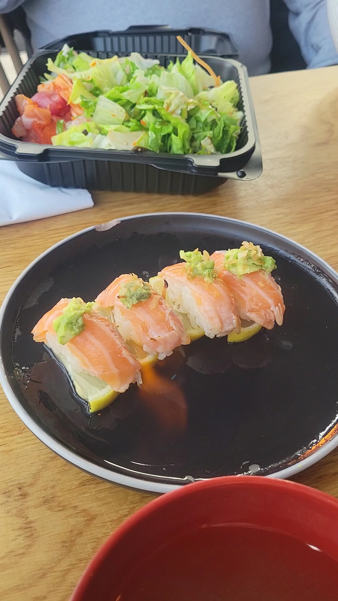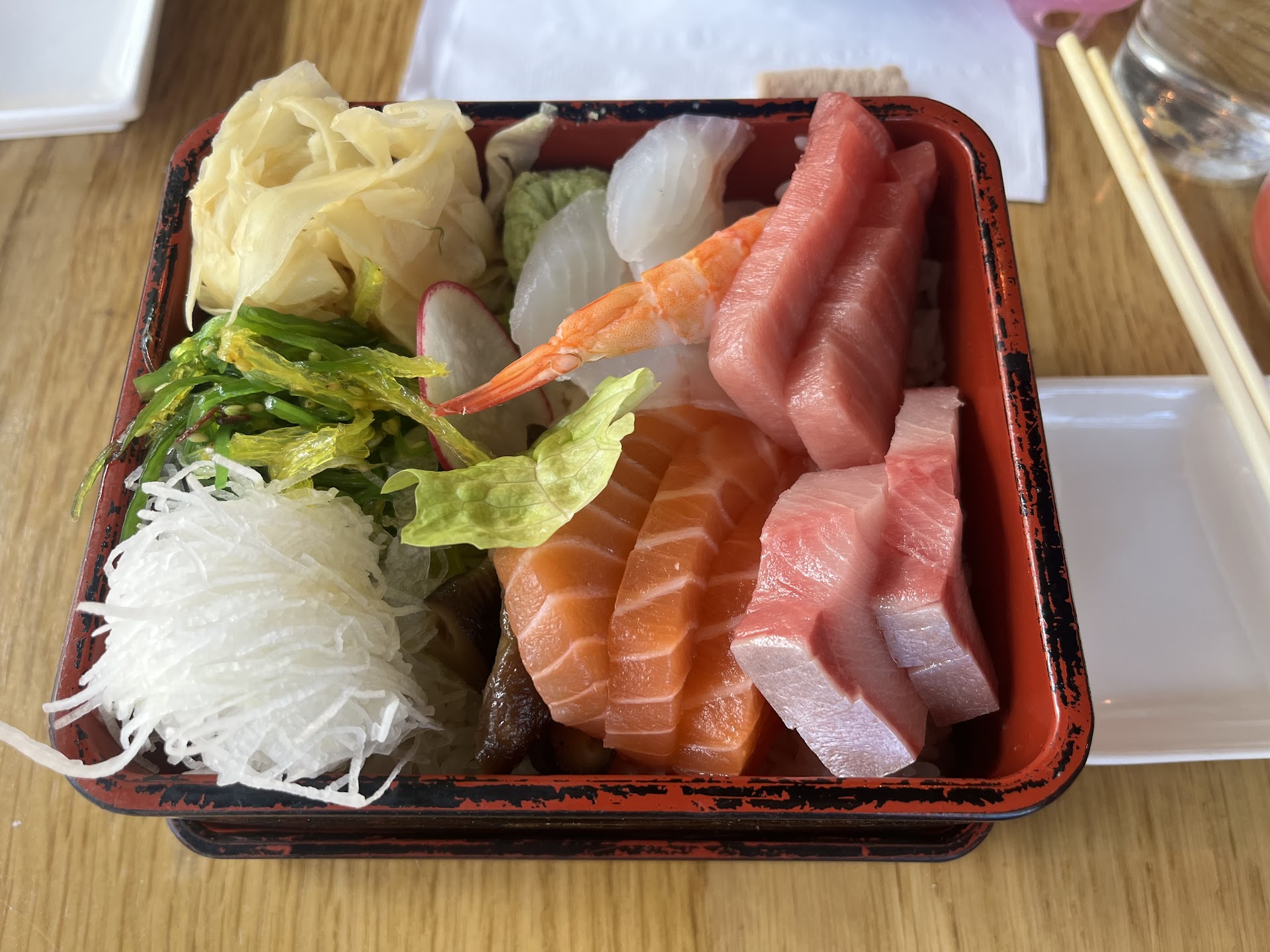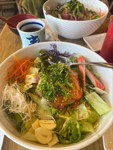 We got the salmon teriyaki bento, the salmon sashimi salad, two different salmon rolls, and a shrimp tempura udon. All of the portions were extremely generous, especially the sashimi salad which arrived in a really big bowl! The amount of tempura you get with the bento is also very generous - shrimp, broccoli, green bean, onion, and sweet potato tempura, along with the salad, rice, salmon teriyaki with veggies, and 3 pieces of a california roll.