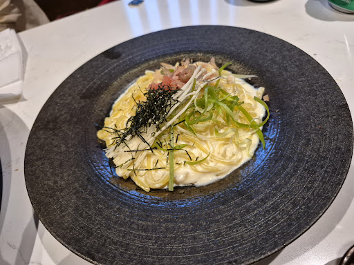 The pasta was delicious. The noodles were unique—not udon or regular ramen but chewy and flavorful. The sauce had a perfect blend of garlic, uni, and butter. While others had cake for dessert, we treated the pasta as ours!