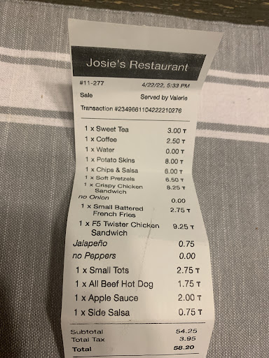 Read moreThis charming place really wowed us! While in Columbiana getting our dog groomed, we searched for a restaurant that served home cooked meals. We found "Josie's!" 🙌 The ambiance is stunning, quaint, and cozy! We were pleasantly greeted, seated, and waited on by "Tanya." She was wonderful!! Her knowledge of the menue, and explanations of how EVERY item is cooked, prepped, marinated, etcetera were amazing! She even detailed all of the "locally sourced" food items, specifically, meats, poultry, produce, and the like! The food was top tier! Like other's have mentioned, the portions are huge! I noticed almost every table left with "left-overs." The food is truly home made, delicious, and outstanding! 😋 We will be back! I have been to all 50 States, and several Countries, and I've never experienced such detailed knowledge of every menue item! The owner(s) came over to our table for a "meet 'n greet", which added to the enigmatic experience!! My husband loved everything as well! We went back to "Rosco's Dog Grooming" and bragged! They are interested in trying "Josie's" as well!! If you are in the area, please stop by and try this delicious food! Dine in, or carry-out. It is so affordable, and made with hugs & love! You are truly treated like FAMILY! We didn't have to ask for anything, [like most places], napkins, refills, etc. A special "thanks" to Tanya and this glorious staff, for making our time there, enjoyable & memorable ❤️ God Speed to all of you!...