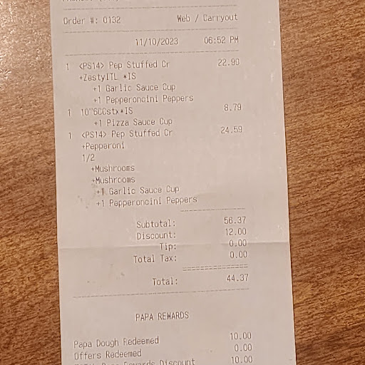 Read moreI love papa johns but this is the closest location to my home and its always a bad experience. You place an order and get a 48 minute wait time, not too bad right? Then you get a text message saying its being delayed and takes 2 hours to get you... The worst part is they cook the pizza and then leave it sit around for an hour until someone (usually doordash) delivers it.