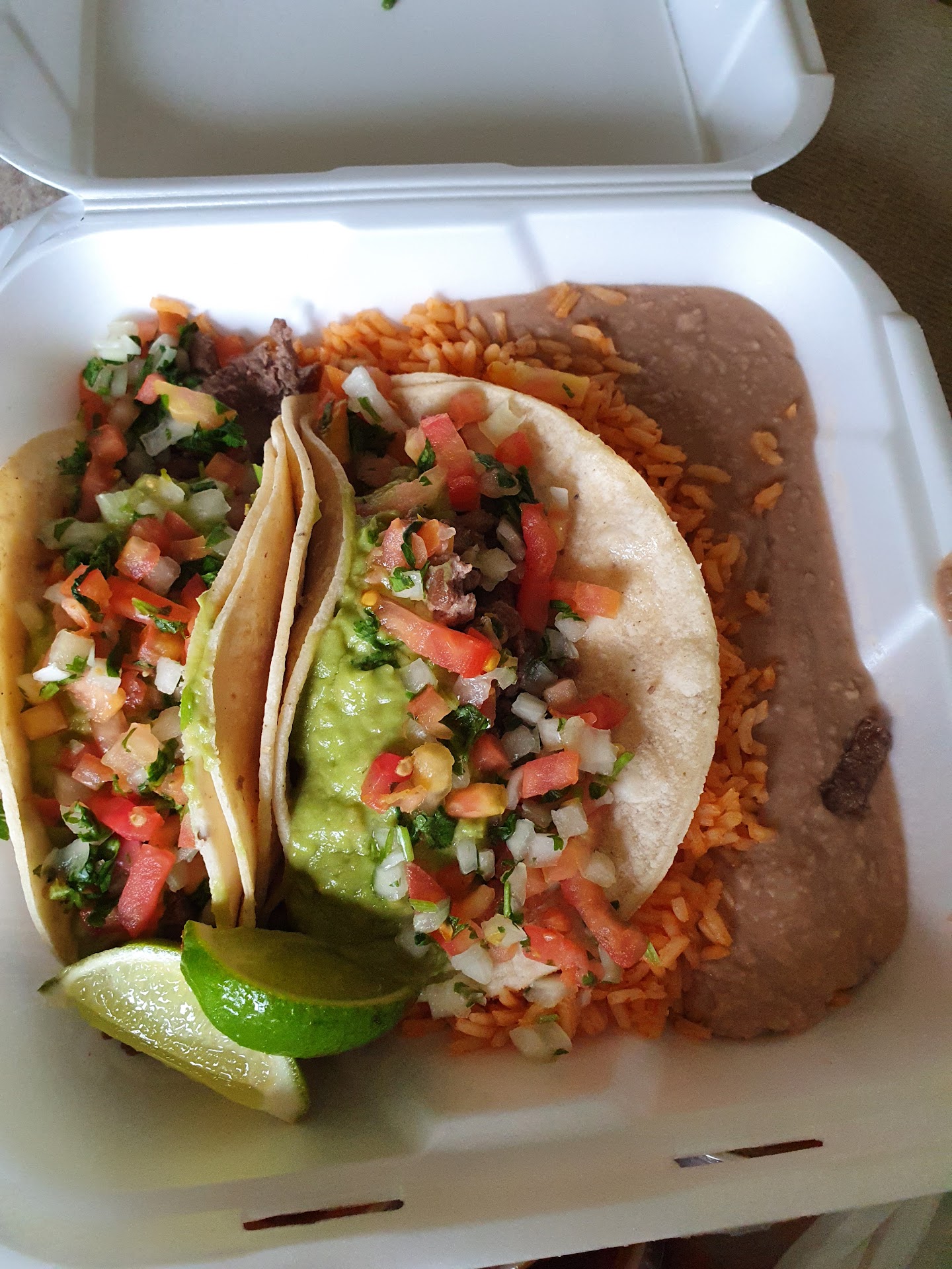 Read moreI've been wanting to eat there for a minute now...the reviews kinda scared me off.. so I get there pretty busy but line moved along just fine.. about noon... It is pricey I got the Taco combo with rice and beans. I wasn't expecting big tacos and a good portion or rice and beans. Big tortillas too. only complaint it the guacamole taste old or bad and the Pico had too much onions. After a few hrs after eating it my stomach was queezy I'm guessing it was the guacamole because that's the only thing that was off. the rest taste good the meat was a little tough and chewy but also thick. I'd give it a shot... I figured people in the day time care more about service than night crew and food should be fresher.