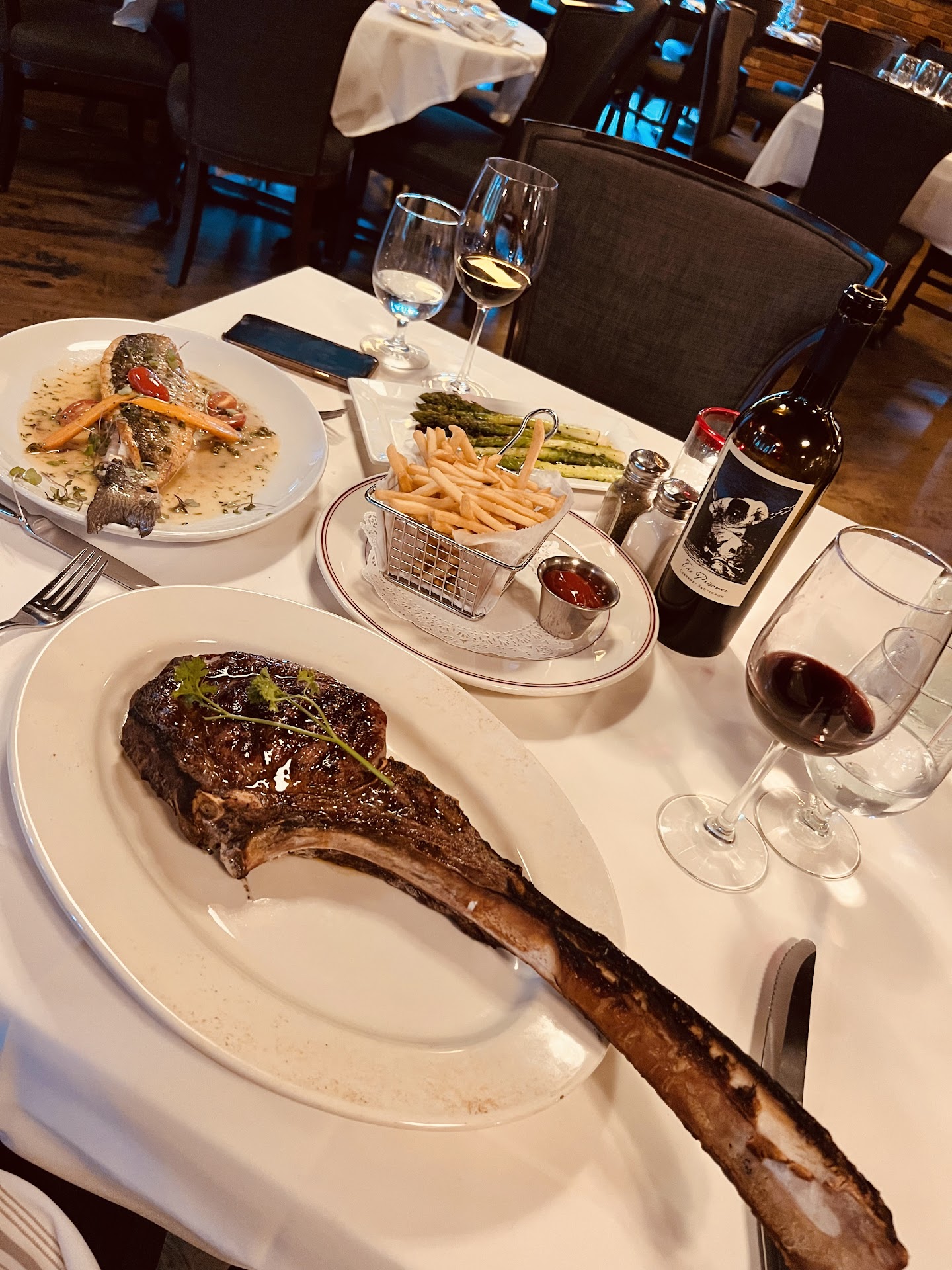 Service: Service was very slow, my partner and I frequently had to wait 10-15 minutes to even see a glimpse of our server, let alone ask for something. When the bread was brought out I realized I did not have a bread plate, so I had to sit while the bread got cold while I waited to see our waiter so I could ask for one. Warm plates were brought out before our steaks since we got the tomahawk to share, but then we had to wait for approximately 15 minutes for our steak so by the time it got to the table the plates were no longer warm. While I would normally not knock a restaurant for this, if you are going to charge the prices they do, and market yourself as an upscale steak house, you must have top quality service.