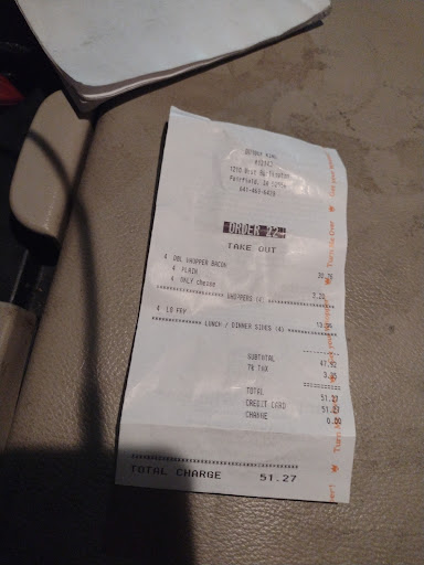 Read moreOur experience was a complete disaster. I'll start first with the amount of employees twacked out of their minds, so bad they couldn't concentrate on taking our order. The employee who took our order decided to take a phone call during taking our order, then had to ask us to repeat our order multiple times because she couldn't concentrate on what we were trying to tell her our order. She was so twacked out that she forgot to add a couple items to my order, so we had to ask for the missing items after paying. After getting our order home, we realized that about half of our order wrong, and definitely NOT freshly made. I was going to call the manager, but I felt it wouldn't done any good because the manager working that night, along with at least 5 or more crew members were so high on meth, I figured they would've just messed up our order again. My family and I are very displeased with Burger King in Fairfield, Ia. And because of these multiple experiences, we will not be returning any time soon or if at all. And I think the department of health should pay this restaurant a visit in...