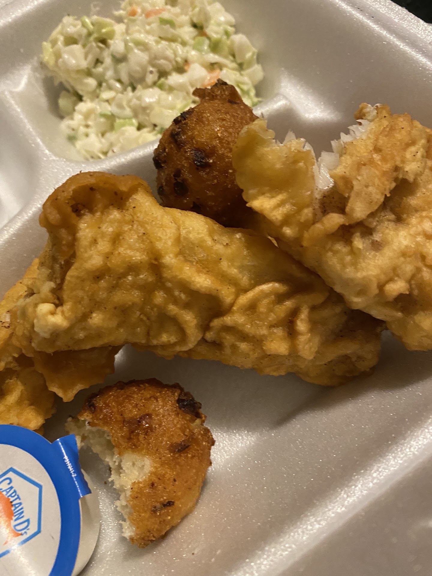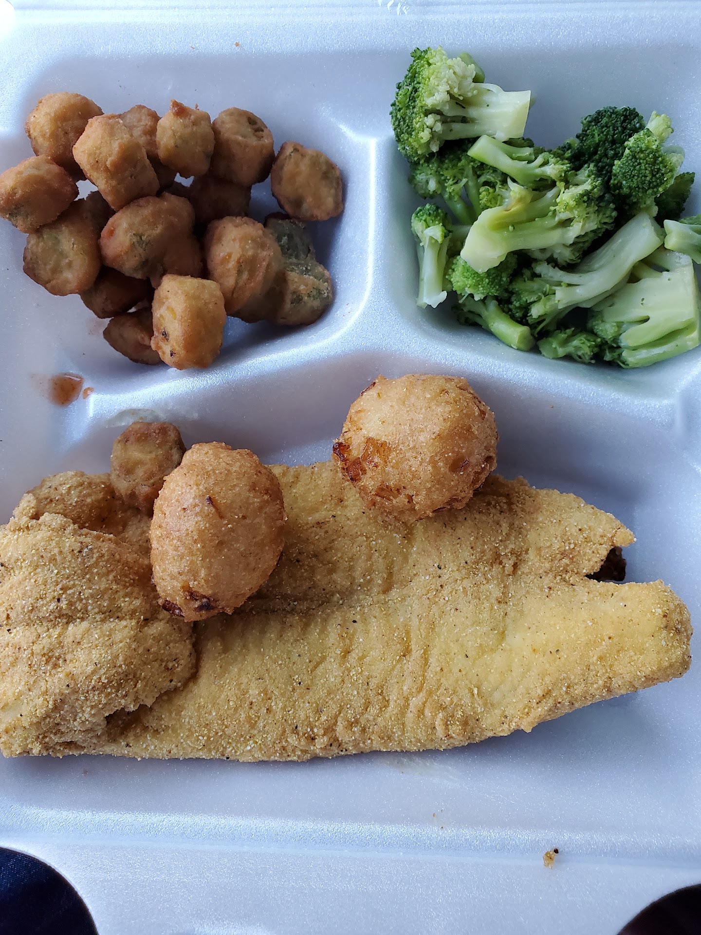 For some reason, the "baked potatoes" that are served are never really more than lukewarm. This has always bothered me, giving me concern about bacteria growth. I asked for them to please microwave mine, but that was not done, so I threw the potato away. The faux butter wouldn't even melt on the spud. The fish left a lot to be desired, as well, unfortunately. It was mostly batter, greasy and overcooked.