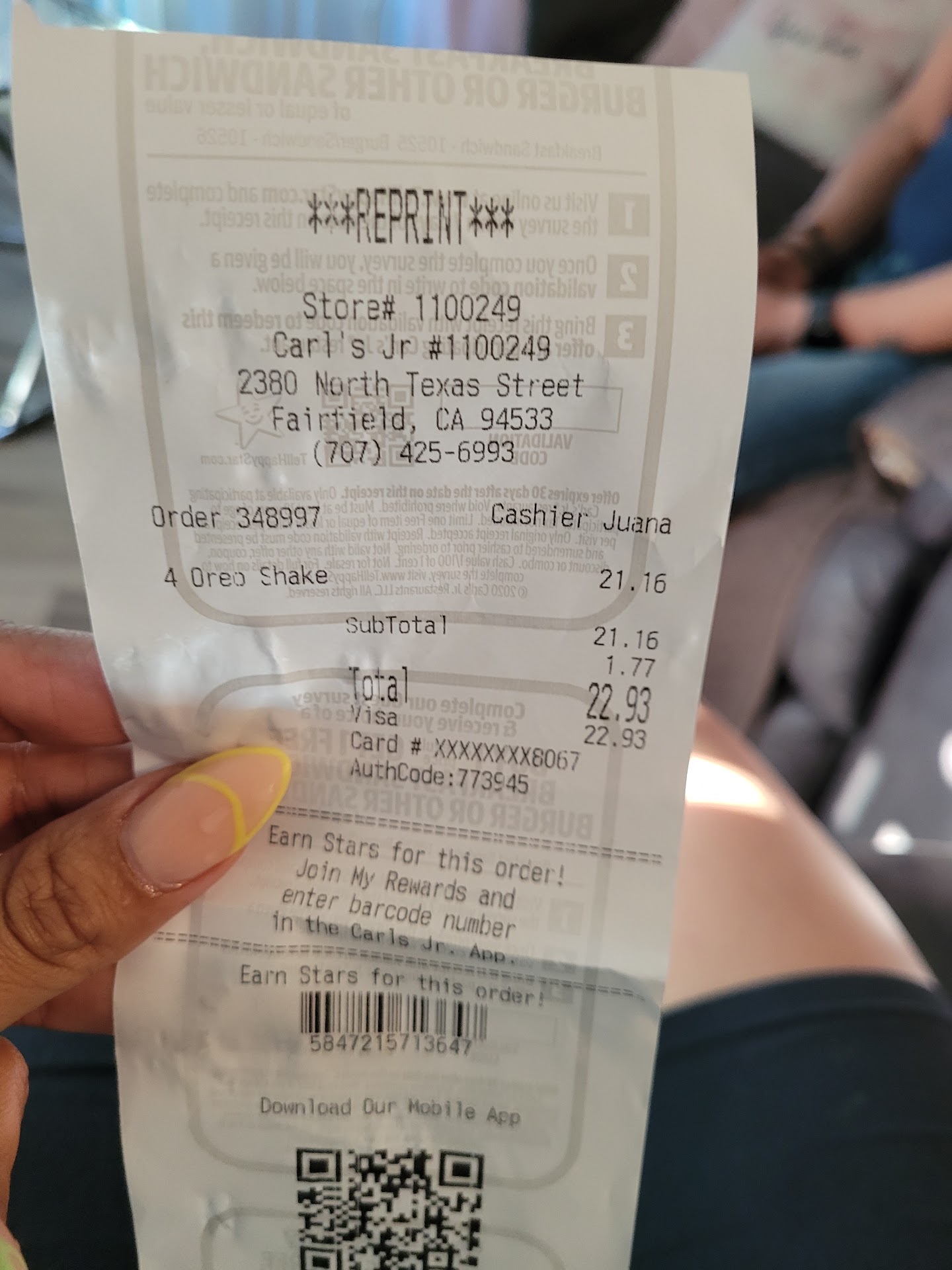 Ā Ā Ā Read moreI don't normally eat fast food , except for Taco Bell burritos and nacho fries yum , or a salad from Jack in the box or criss cut fries from Carl's Jr . I never eat chicken and I never eat any meat from a fast food restaurant . On this evening we'd been shopping all day long and I just wanted some fast food because I knew after I got home and unloaded the car , carried in everything put it away and delt with whatever I'd be too tired to cook . My son wanted bean burritos from Taco Bell ( before they came out with nacho fries ) so I thought I'd drive across the street and get a dollar soda and criss cut fries from Carl's Jr . The guy at the window was friendly and I went to park in front so we could eat while everything was hot ( my son was already on his second burrito lol ) my fries were kinda warm and not crispy so I debated whether or not to go inside ugh I did . He couldn't of been nicer apologized and said explain the cook was new . I said no problem we've all been there he said go wait in your car and I'll bring you your fries . He came out a few minutes later with the really hot bag of fries and a cheese cake and told me to have a nice night š Kinda changed the evening for me . We shared the cheesecake and went home . What a nice guy. The store was clean friendly staff ....