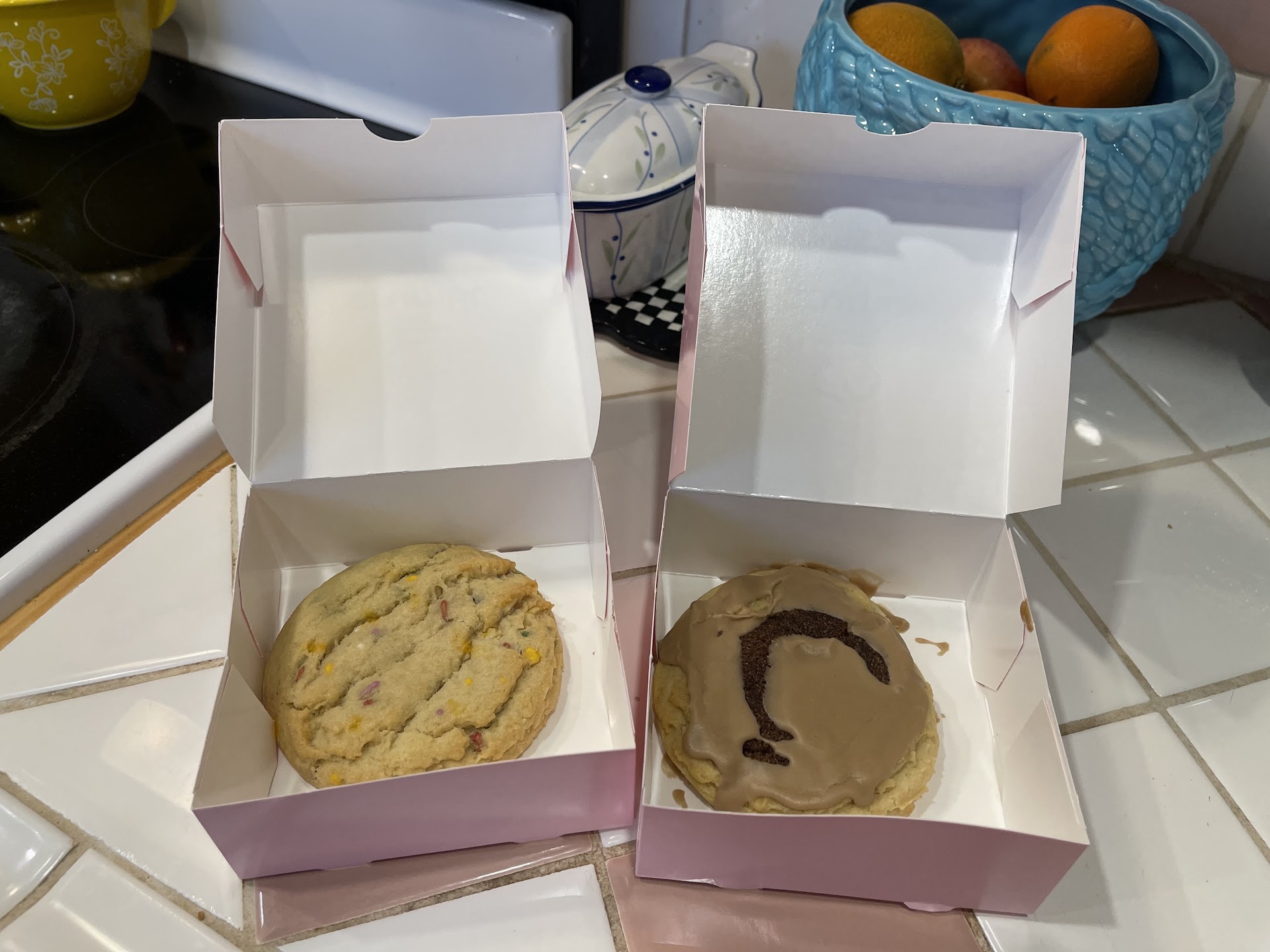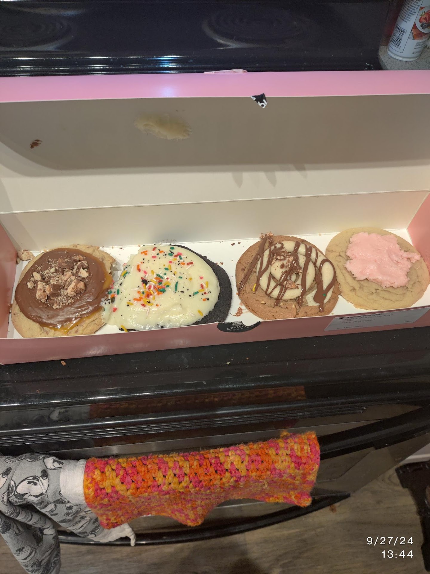 Read morePoorly prepared cookies. Misshapen, center of 2 cookies were raw dough, decoration was messy. Something was wrong with the recipe.. chocolate glaze looked like Hersheys syrup, marshmallow cream was a weird tasting vanilla whip cream. I ordered 4 cookies, the only edible one was Butterscotch, which was over baked, it at least tasted good. I ordered on the app and drove to Fairfield because they had they still had the chocolate mallow cookies. The store bleak and messy, one kid working, a few others in the back just hanging out. Everything about my experience and quality of the cookie felt like a teenage shrug of 'I don't know' and 'my bad' unceremoniously dropped into a pink box.