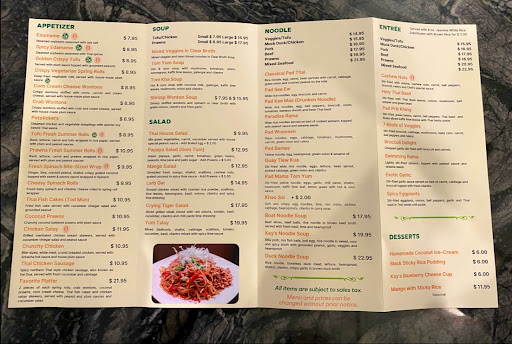 Read moreI moved to the area and drive by Kay’s every day on the way home from work. It always looked like something I would love and today I stopped in for a Wednesday lunch on my only day off. Kay immediately offered me a seat and was extremely kind in every way. There was a lunch special of rice, pad Thai, crab dumplings and an entree of your choice! I went with the Massaman curry because it was something I have never heard of and that is something I always love to try to do and get something new. The food was ready in what seemed like less than 5 minutes and had amazing flavor. Never ending herb combinations and bombs of flavor unlike I’ve had in other Thai food. Kay talked to me the entire meal and was so nice to speak with and happy to answer any questions I had. I will 100% be going back and recommending this to all my friends in search for great Thai food! I hope to learn some of the Thai cooking practices and Kay was very happy to set up a time in the future I could come in a learn from her in the kitchen! A true dining experience unlike I could ever imagine....