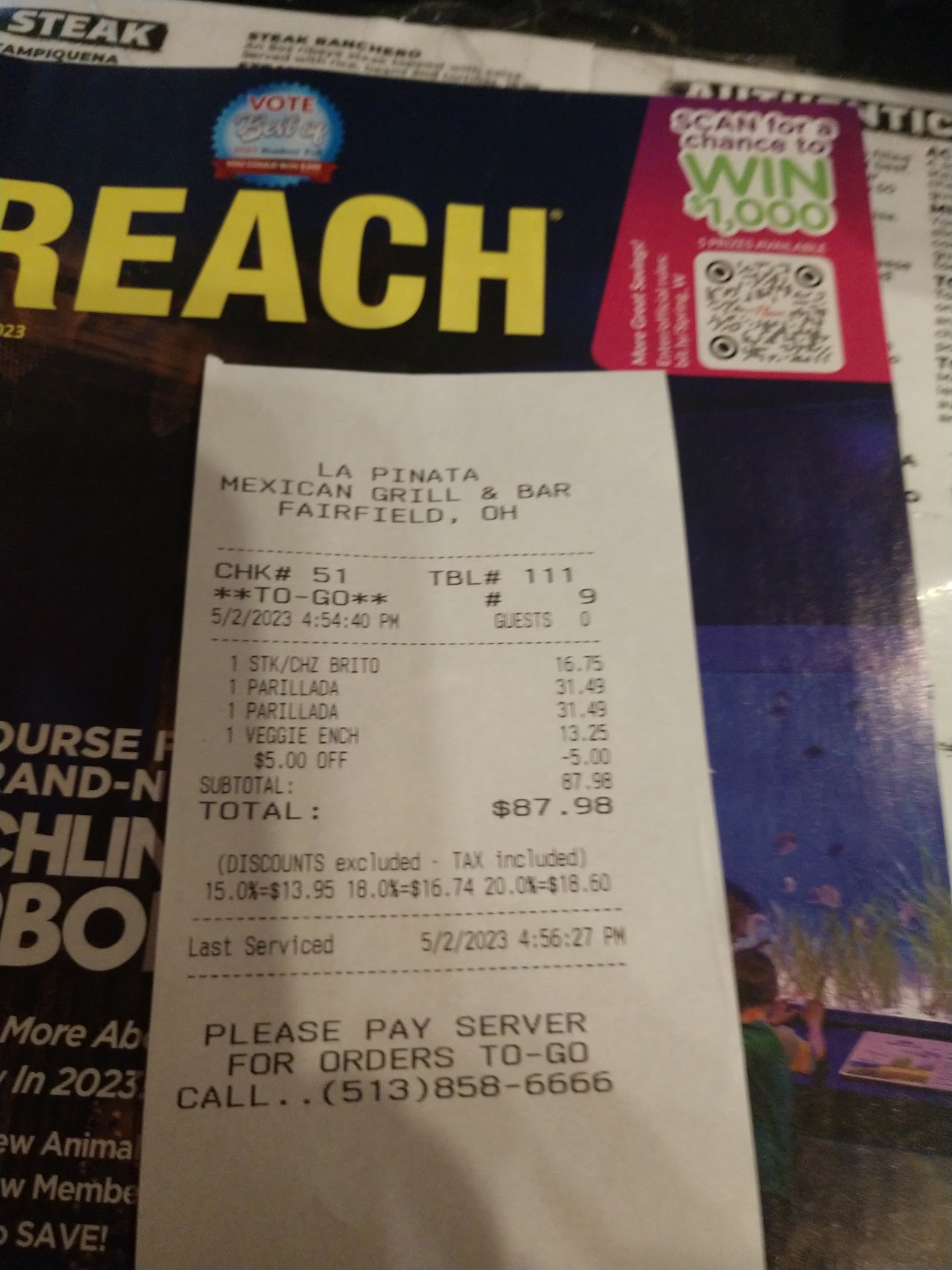 Read moreI compare all Mexican restaurants to Abuelos and this one rates very well as far as the quality of ingredients but is not as authentic as Abuelos. the ground beef was not greasy like some restaurants are. The shredded beef was completely fat free and all tender quality meat, the shredded chicken was moist and they put a lot of meat inside the enchiladas. The service was however lousy. After our meal was served he only stopped by once and never again. I ran out of drink and did not get a refill until we finally flagged him down to give us our check and I asked for a to go drink. Then when we got the check he didnt tell us we pay on the way out so we sat there waiting of him to come get our check. There were dirty tables that sat there the whole time we were there and they staff were just messing around doing nothing. There were only 3 people in there on a Sunday around 2pm and the table was still dirty...