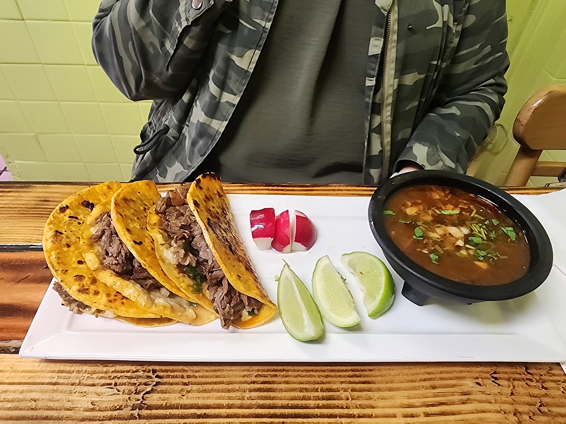 Read moreWent here for the first time after hearing positive reviews about it, and on weekends, this place seems to always be packed. Well, let's just say my wife and I were underwhelmed. We went in and were seated right away. Our orders were taken from the waitress, she brought our drinks out to us, and that was the last time we saw her. She didnt leave. We saw her helping other people, she just never came back to check on us 🤷🏽♂️. The cook (I assume) brought our food out to us. They weren't very busy, but the area was so loud. Between the noise of the kitchen and the radio station that was playing, we had to speak loudly just to hear one another talking. On to the food. My wife had the quesabirria tacos, and I had the burrito mojado (wet burrito). My wife said her tacos were just ok. She did, however, love the consomé that came with it. My burrito was...meh. The molé sauce that was poured on it was very thin. The taste was just ok. The burrito itself (Carne asada) was lacking in flavor. The first 1/3 didn't taste too bad, but then the flavor just disappeared. Well, we tried the place, but probably wouldn't go back. Maybe because it was a weekday in the middle of the day? Maybe the cook/s had an off day?...