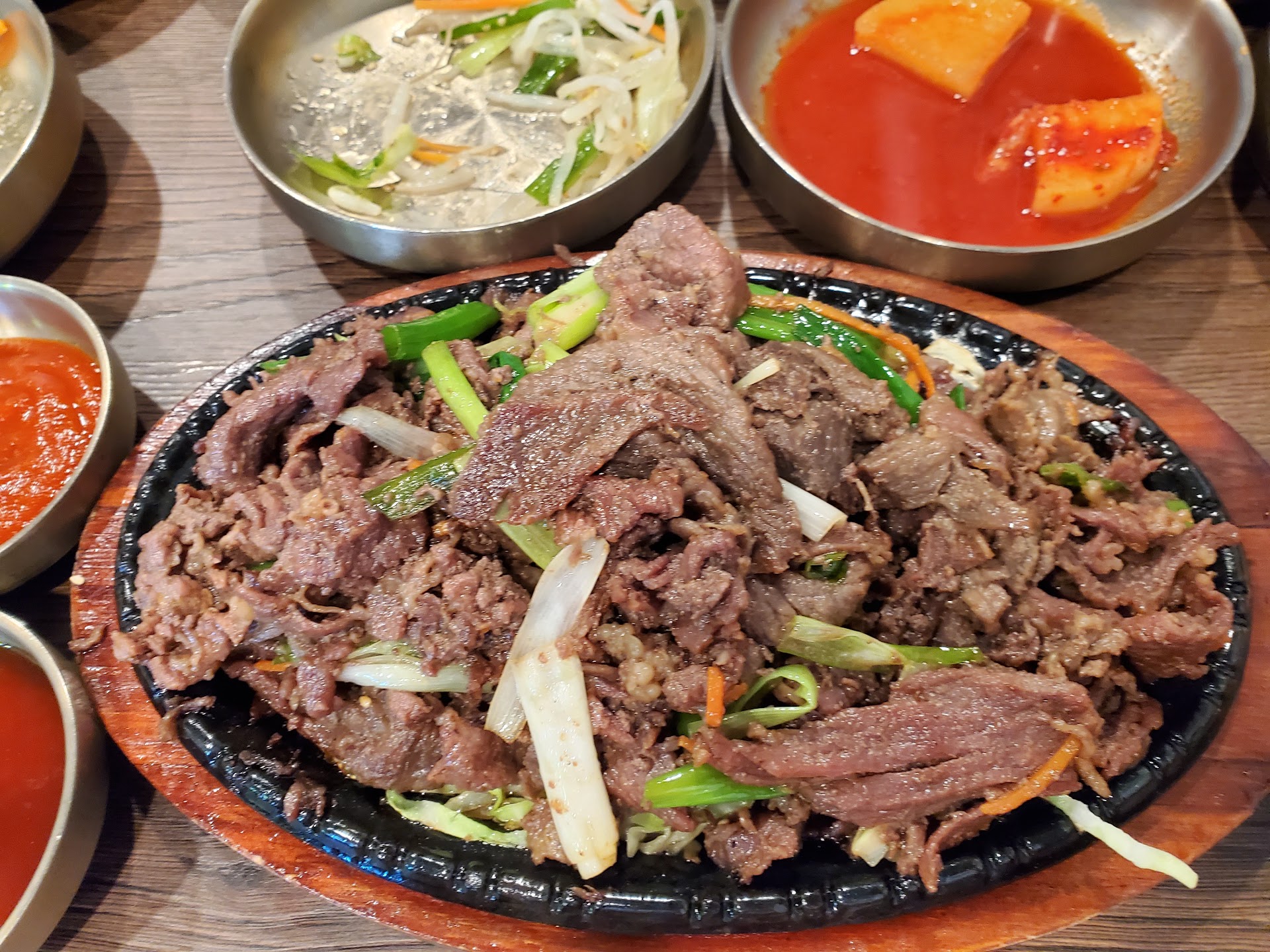 Our first time here. I read about this place on a fb group page months ago & finally had a chance to try it. Didnt even notice it here even though I frequently the area often. Its kindof in the corner and the sign is so small. Walking up my 1st impression was on no, they have the front door held open on purpose, I thought they must not have air conditioning, which for me is a hard pass! I will never pay to eat in an uncomfortable environment, did that once swore never again! I wouldnt sit & eat if it were too warm, even if the food is free lol. I mean it's not a pic-nic ya know. If a restaurant cant afford AC then they need to close. I digress. It was actually fairly cool & not uncomfortable BUT when you have to fight off flies at your table & I mean constantly then I may or may not go back because I find that extremely frustrating & well for lack of a better term, kinda ghetto. So the door being open is an actual issue. Also worries me a little about how many flies are landing on the food in the kitchen. Yicks! However, the food was all delicious. Very flavorful, very tender and all the tiny sides dishes were yummy. Yes,it is a tad overpriced & they charge 2.00 extra for the Hot Stone which I think is hilarious but they do offer refills on all the tiny sides they give you & that makes up for it I guess. Service was fast & super friendly but not real helpful. I just feel when they ask & find it's your 1st time, they should offer suggestions on what is really good or maybe what is most popular. It would have been helpful. Other than the flies, they dont wipe the edges of the tables. I got something sticky on my hand while we adjusted our table because it was sliding all around & then I watched several tables get cleaned & they only wiped the top & well the hand should also run down the sides of the table top?? Food & people can get messy, things spill etc. I was a little grossed out by touching the edge of the table & having something sticky all over my hand. Lol but I always carry hand sanitizer. If it weren't for the flies, I would totally just order take out in the future. But now I am going to have to check it out every time I drive through & see if the front door being open is a regular occurrence. I just really dont like seeing them land on my food at the table & I know in the back they aren't fighting them off like we were at the table. You know what I am saying. Oh and the bathrooms are NOT well kept. I didn't go but my wife did to wash her hands & she told me that I wouldn't want to use it, so 🤷. Sorry the pictures were not taken when they first brought the food, I forgot. Again, it was all really delicious. Not the best I have ever had but flavorful and not overcooked which is important when it comes to meat. I think the issues they have could be corrected with...