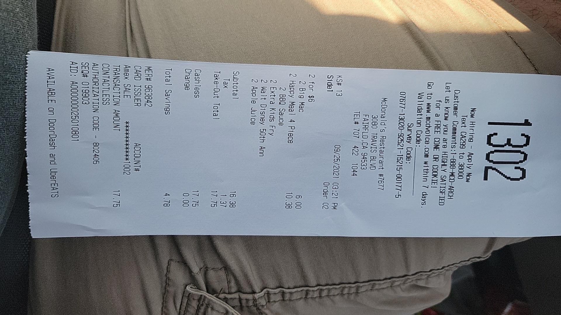 Read moreI went through the drive through. I will say that the area is always kept impeccably maintained. I have never seen any trash on the ground. They have two different places to take your order. The cars have to file in like a zipper to get the orders correct. The people working are always polite and patient. You have to remember to swing the right turn wide. The driveway takes a sharp right turn to get to the pay window. I like it because the employees always accommodate me when I ask them to pull their machine out so I can use my Samsung pay app. If you have the McDonald's app they always have better coupons than the Suisun City store. The few times that I went inside the restaurant it was a standard McDonald's restaurant. It wasn't like the one in Lafayette, Ca that has a lot of TVs. On my visits to sitdown and eat, there was never trash left around. There wasn't even any dirty tables. It is a nice friendly neighborhood restaurant that is a good place to get a quick...
