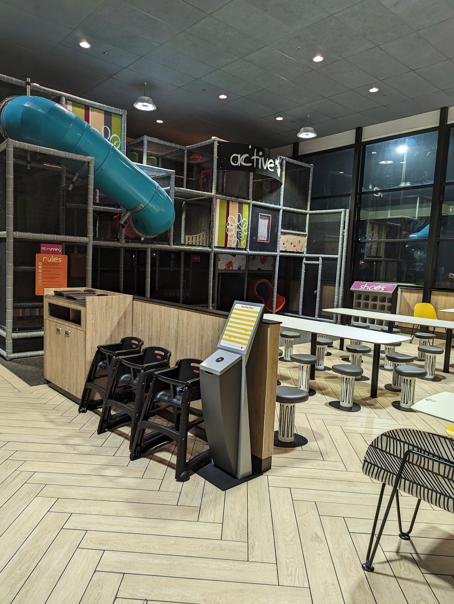 The kids play area was clean and welcoming. Maybe just because it is new but hopefully it stays clean. There is a section underneath for smaller kids and the main play area is meant for kids above 4. My 2.5 year old played inside the big kid area and had a little difficulty climbing the large steps but he was able to negotiate it. He was timid when it came to the large curly tube slide but he eventually warmed up to it and went down the slide several times. He enjoyed the little kids play area because it had pictures that he could flip and spin around, a small slide, a ball that makes noise as well as another slide that sounded like a piano when you went down it. In addition to this, just outside the play area, there were video games that worked and a screen which had lights that would change colors when you touched it.