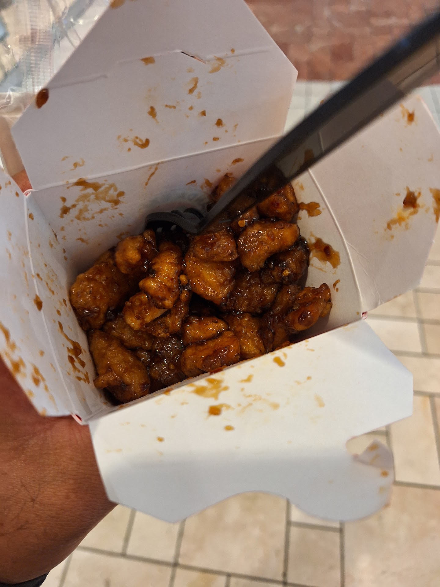 Read moreAlmost paid the price of a whole meal just for a medium box of 🟠🐔. I haven't eaten panda in over 10 years because the quality was so bad back then, but I have to say, this time around, the orange chicken was pretty dang good. Unfortunately, I couldn't taste the 🐓, just 🍊, and that more than anything is what puts me off about 🐼. I'm still not ready to try their noodles or rise because I'm sure it's going to be dry as heck, but what do you expect from a Cheep-otle style restaurant. Left overs all day unless you can get it all fresh....