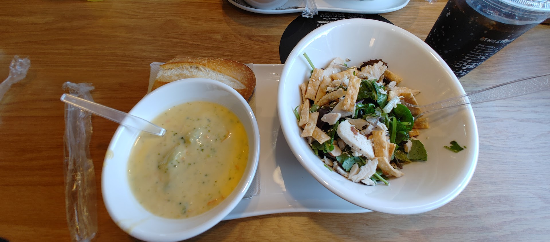 Requested that a table and bench that were covered in crumbs and greasy smears and handprints be wiped down for my family. The employee came and wiped the table only and then took off to wipe the drink station, completely ignoring the bench which was dirtier than the table had been. She didn't even take the opportunity to wipe the table next to us which was much worse than ours, she seemed distant and bothered by our request. For the rest of our dining experience, we didn't see a single employee cleaning tables or anything in the dining area. Our soups were cold and under-filled, my Frontega Chicken panini was room temperature and the mozzarella slice was still a solid block and completely unmelted. The option to sub other bread types for sides was missing from the touchscreen ordering tablets, and the baguettes we ended up with were so tough and chewy that they hurt our teeth. I understand many places are currently understaffed and suffering from supply chain issues, and in light of that I don't mind waiting longer for my food. But while a longer wait may be justified, cold/undercooked food and inattentive...