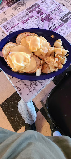 This is a very busy place so if you don't have patience then this isn't the place to go. We came here for breakfast yesterday and the food is absolutely delicious. They serve breakfast and lunch meals at any time of day. They are open until two in the afternoon everyday. We came yesterday around eight in the morning. Was pretty busy but the portion sizes are worth the wait, it reminds me of Big G's. Parking seems okay, they have vegetarian options, and it's definitely kid friendly. They have a ramp for wheelchairs and plenty of booths and tables. They have a back lounge as well. The decor is pretty nice, photos all across the walls of the restaurant. It's a cozy atmosphere. I got the eggs benedict, they put a lot of ham in it, most places don't. I got a side of potatoes/hash browns. The potatoes were yummy and the eggs benedict was amazing. I got a side of stuffed french toast, not a lot of cream cheese in it but was still good. My husband got pancakes that were bigger than his head. No joke. Portion sizes are definitely worth the price here. The waitress could have been more attentive but she did have a lot of tables.
