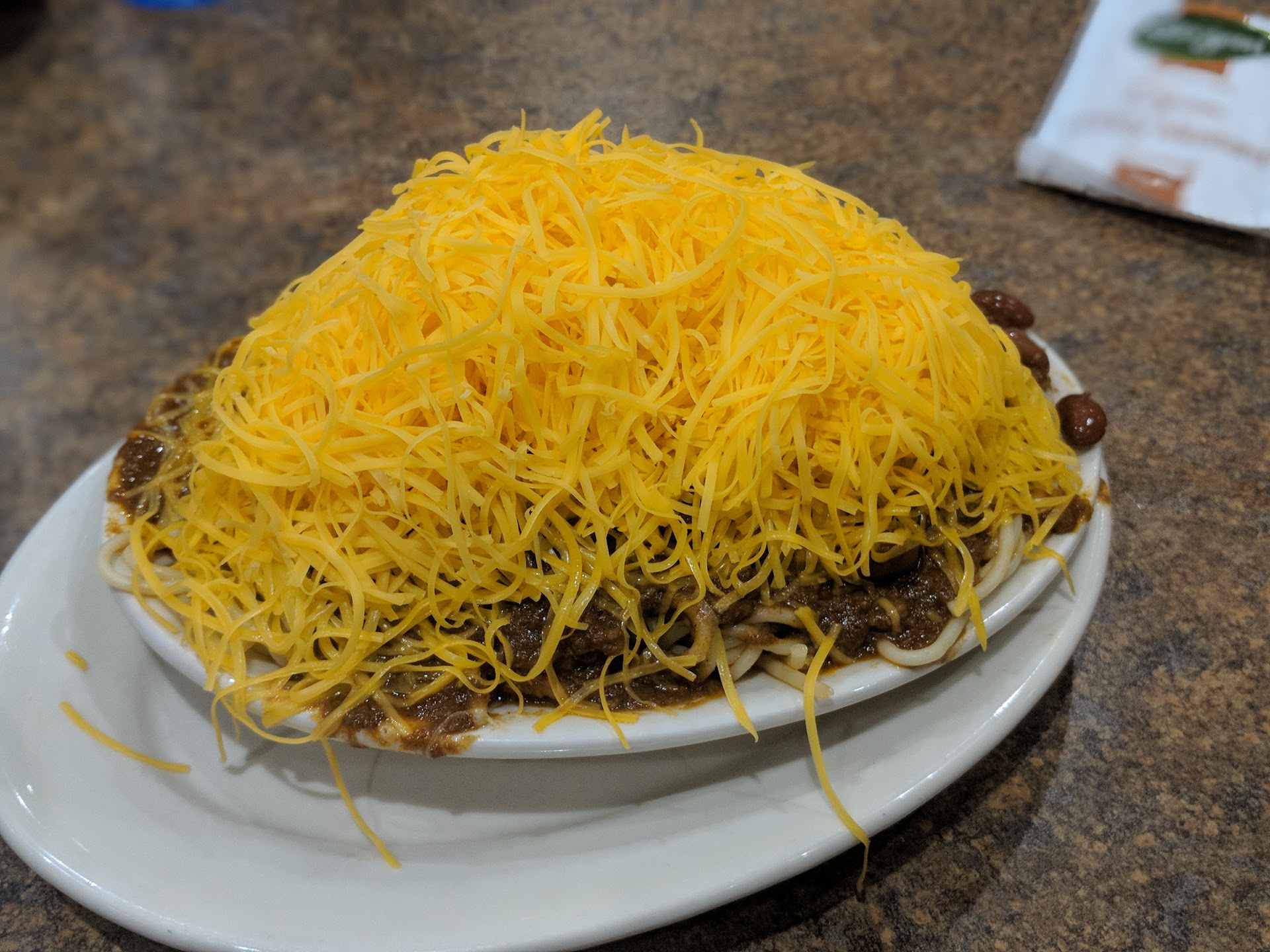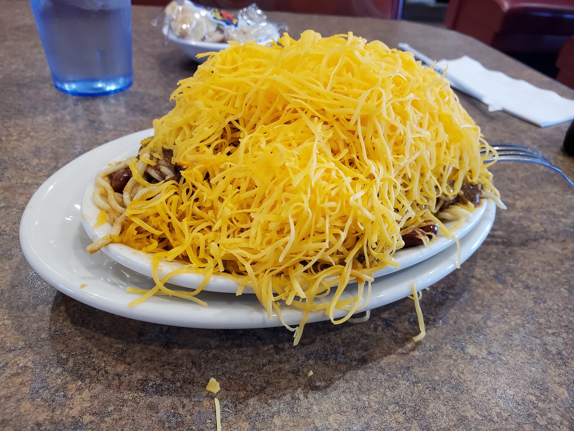 Read moreAs a visitor to the Cincinnati area, I was told I had to visit Skyline to try some of their trademark "chili." My coworker and I let the waitress know that we'd never tried it before, and she promptly brought out a small sample dish for us to try, which I thought was really nice. I went ahead and ordered the "five-way," and my coworker went all-in, ordering the five-way, a coney, and some cheese fries (all three of which came with a mound of shredded cheese atop). He ended up enjoying the coney, but wasn't a big fan of the chili/spaghetti, meanwhile I thought it was perfectly good. Although it's not something I'd want to eat all the time, and it shocks me to see the sheer number of these places around town, I did like it enough to come back for a second helping before ending my work...