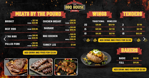 If you're looking for Awesome Ribs in Fairfield, keep looking. I visited The BBQ House because of the outstanding reviews. I ordered 4ea. individual Spareribs, Dry, @ ($3.00ea.) a 1+ lb. Dino Rib ($38.89), 10pc. bone in wings (naked) ($10.99), a Brisket sandwich with potato salad ($15.95) and a pulled pork sandwich with fries and Mac & Cheese ($13.95) Let me start off by saying "Everything" was salty. Possibly because of being heavy handed with the seasoning salt. The Ribs were "not" fall off the bone, but I've had worse. (5) The Dino Rib was very juicy and cooked very well. (6) The Wings were tiny and overly seasoned like the other items but was welcome and acceptable on wings. (7) The Brisket sandwich was for my Mother-in-Law, and I haven't heard back. The Pulled Pork sandwich with Fries were both salty according to the misses, but she did say the Mac & Cheese was very good. We won't be craving this place anytime soon, but I'm sure we will try them again, once they've had a chance to refine their recipes to work with Dickey's old equipment.
