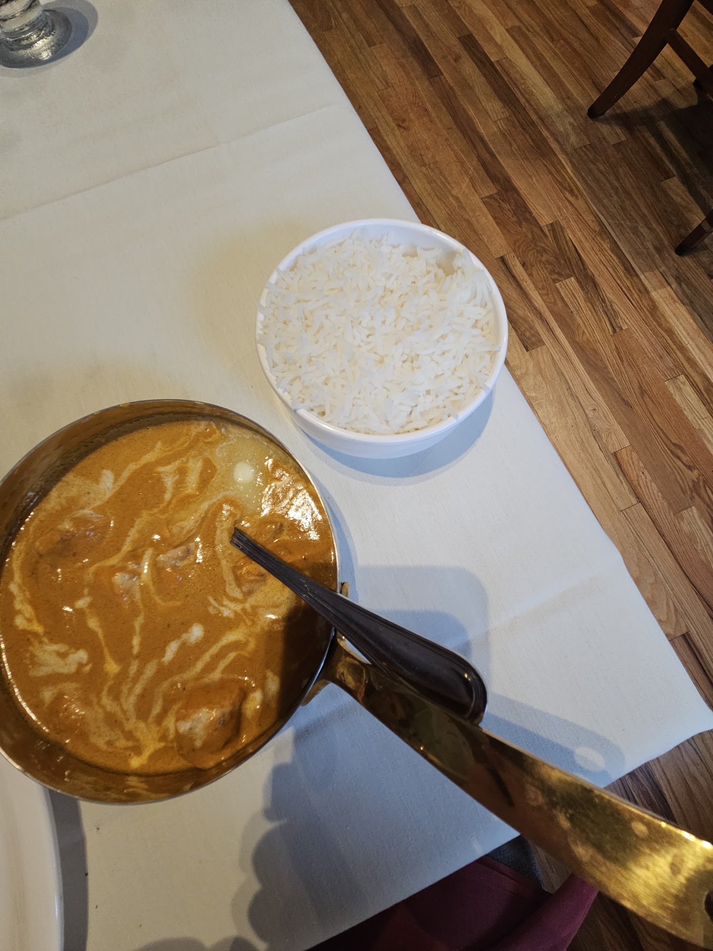 The entrees were magnificent. The favoring was rich and very delicious. I enjoyed the butter chicken served with jasmine rice. The sauce was very good. My companions ordered their dishes spicy. They were underwhelmed with the spiciness of their dishes. One order is the lamb/goat vindaloo ($22) and the other chicken Tikka masala ($20). I should note the plates were empty nonetheless.