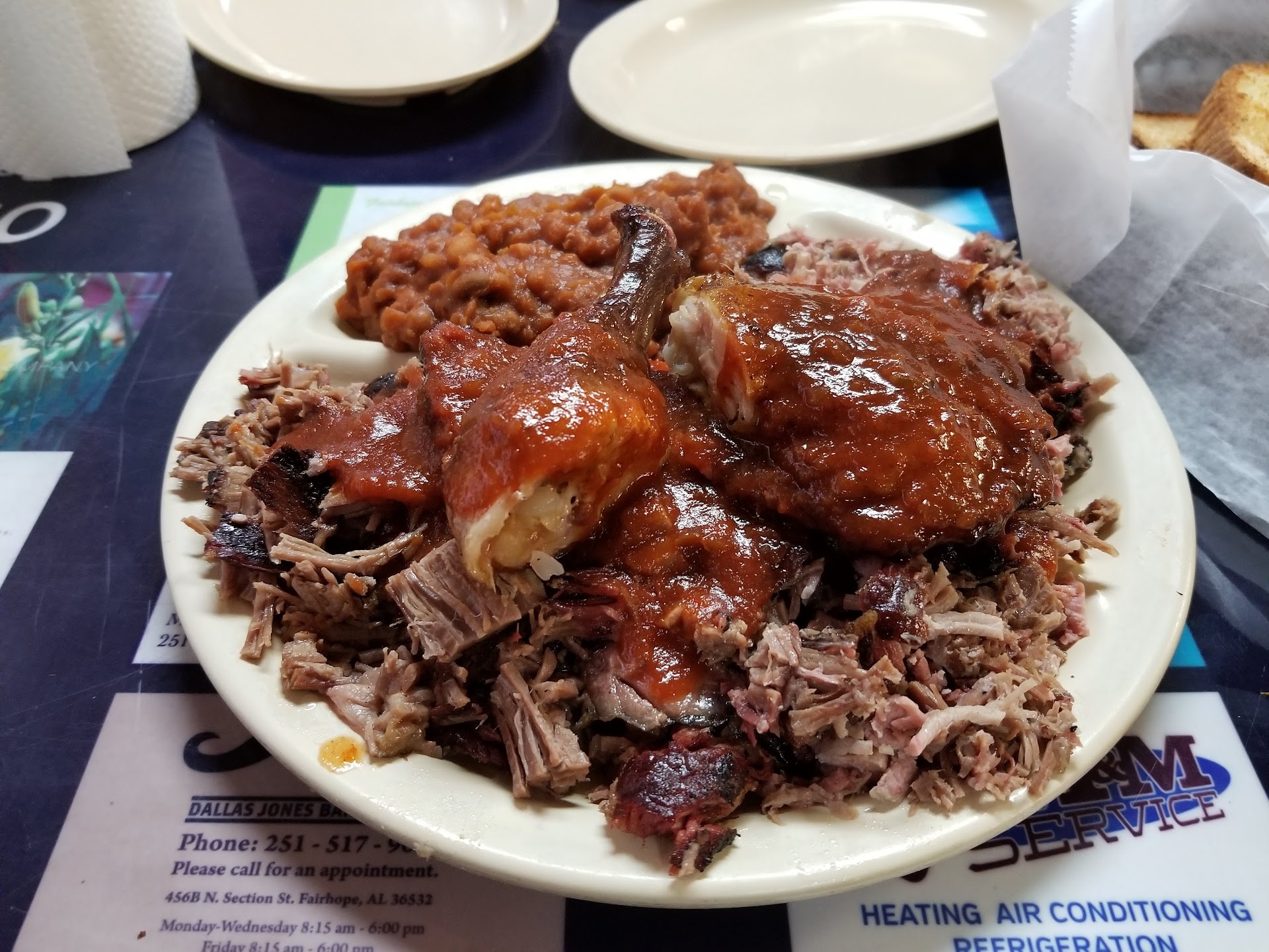 Read moreWe visited this place based on the reviews that it had and its proximity to our destination. Please do not be misled by the beauty of my pictures. Both the beef brisket and the pork were chopped. This was not what I expected and should be expressed to those ordering the BBQ platter. The potato salad was less than desirable. The business, it seems, is a fixture to Fairhope and has a rich history. I have seen people compliment the "at home experience" of the place. If by "at home" they are referring to the cobwebs throughout (one with a huge beetle in it), filthy window shades, sticky floor/carpet and waiter who had his bare hands over the mouths of our drinks, I suppose it is indeeed "at home;" just not MY Home. My friend's seafood platter was okay. We are enough to satisfy our hunger and left so that our waiter could finish vacuuming. We would not recommend this place to tourists or locals and will definitely not be back. If anything, I would order the seafood platter to go. Then again, if the kitchen unseen is anything like the visual delights in the dining area,...