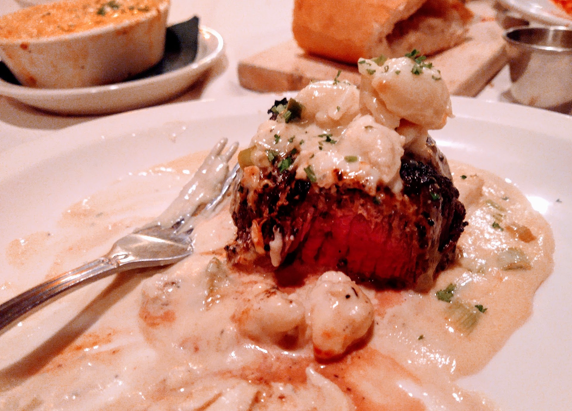Visited at the beginning of March. Not kid friendly although they do have high chairs. We were hoping for aquariums but nothing, it's actually a very small space and kind of awkward when you walk in, at least it was for us since we walked in holding our 10 month old with no reservations to find ourselves in front of a very nice birthday dinner right by the entrance. Our server Amanda was very nice and attentive. I wish I could say it was the greatest meal I've ever had but it really wasn't. My favorite part of it all was the scalloped potatoes we got for our baby and the Bonanza wine which was excellent. Stuffed peppers were a good appetizer I recommend. My husband got the chicken Parm and I got the crab "stuffed" fillet. I say "stuffed" because it was not, they should call it fillet with a few pieces of crab on top and the worst part was that it was topped with a sauce made with blue cheese. They should really tell you this because I don't like blue cheese so that completely ruined it for me. The filet was a good cut but I honestly wouldn't pay what I did for it. I ended up paying $69 for a tiny crab topped fillet drenched with blue cheese and of course, I was up charged for getting French onion soup as my side so my meal alone was $85 including my glass of wine- not worth it. My husband cut me some slack since it was my first time ordering something without the price on it but since the ribeye was $40 I had no idea a smaller piece of meat would be that much more but I was wrong. I really wish I could have enjoyed it more but in my opinion blue cheese is very over powering and that's all I taste if it's in anything. I don't think blue cheese is the most popular thing so not sure why they wouldn't tell you considering how good the service is. It is not a place I would go back to, I can literally go anywhere else and get a good fillet with wine and potatoes and not pay almost $100 per person. We live in Colorado now and those prices are something I expect here but not over there, if they are trying to blame the crab it was not even an oz of crab on top so I don't know what holy cows they are getting this meat from but it's not right in my opinion. Regardless, we wanted to try this place and we did and now have something we laugh about and learned my lesson about ordering things without a...
