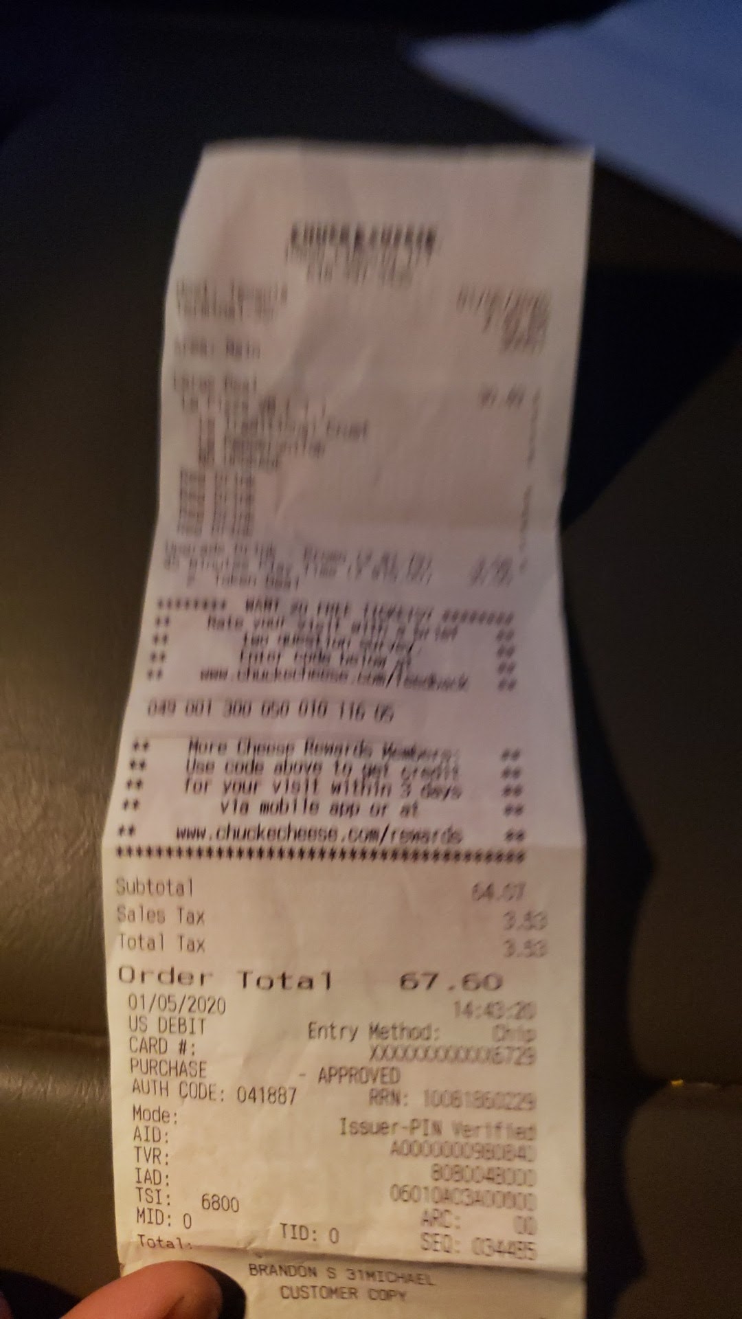 Read moreI am not normally one to write bad reviews but this place is terrible! I made birthday party reservations here and it was a huge mistake, making online reservations are pointless going to this chuck e cheese.. they brought the wrong the cake out, wrong dip n dots, it took almost an hour to get pizza... I had to ask multiple times for cups for adults which took about 30 mins just to get cups.. The bathroom was filthy, a toilet leaking all over the floor there was toilet paper all over the floor and it was gross,, the stage was filthy and Chuck E on stage had a messed up eye that scared my kids. (photo posted with this review). A lot of the games didn't work and out of the ones that worked barely any of the machines actually gave tickets. My party host was barely helpful multiple times I had to leave the party to look for her because she never came to the table, we had to go to the soda machines to refill our pitchers because she barely came to the table... another lady who worked there would tell us " i am not doing partys" if we asked her a question but she was standing around by the partys.. there were 3 other partys at the same time as ours and it was insanely chaotic and they did not have nearly enough staff no one that worked there knew what was going on and it was so frustrating the play passes didn't work and neither did the bracelet out of 5 of them only one worked and it was another 25 min wait to find the host to get the cards switched because no one else would help ..after chuck e came out to sing the birthday song and take pictures with the kids they completely skipped our table. If you plan on making reservations for a birthday avoid this place.. it was horrible I am honestly shocked this place is still...