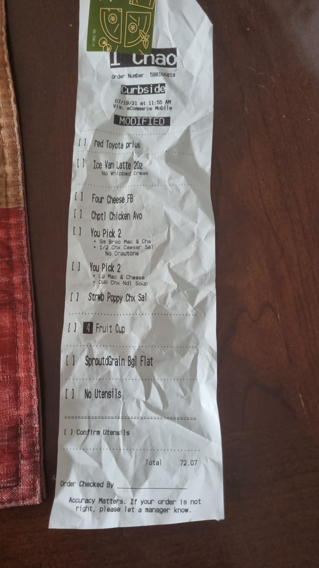 My mom ordered a curbside today, but when we got home we noticed that her sprouted grain bagel was missing. We were indeed charged for it because it was on the receipt.