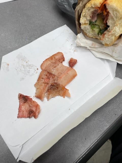 now the banh mi, the bread was soggy after i had a chance to eat it , but if was prolly crispy at lunch time. i got the roasted pork and it had to be the grossest bahn mi i have ever eaten . the meat tasted like slimy raw bacon fat. i pulled it out and it was pure fat. another piece pulled out , same thing. all the meat inside was disgusting. i have pics of what looks to be pink colored thick cut bacon fat. totally empty sandwich for $10. go to stl for a much better sandwich for $6 or $7.