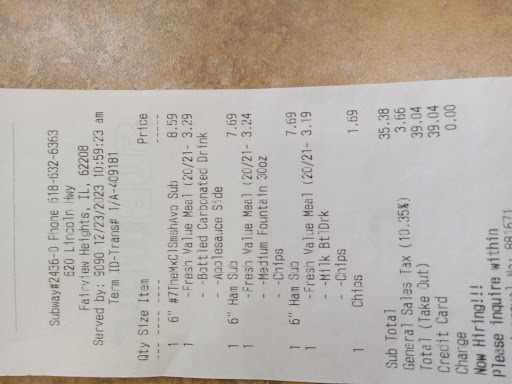 WARNING!!!! AVOID the subway on Lincoln trail at all costs! I wish I would have. So very overpriced to begin with, but I ordered 2 sandwiches and a kids meal. I probably said KIDS MEAL 7 times before paying. At the register i caved and made the other two sandwiches a meal. Now for those counting that's 2 adult meals and 1 kids meal. Look at the receipt. That's 3 adult meals and an added chip! A woman came in later as we were about to pay. When I asked about the price being ridiculously high for 2 adult meals and a kids meal before I paid I was bullied and yelled at. They said pay it now and we will fix it in a minute. We have other customers to help now. You are hindering their meals. You must sit down now! Ok...now I transferred from fixing a little mistake which everyone does now and them to livid. This is intentional. This is their scam. The little guy was hiding behind the screaming loud mouthed woman. On and on she screamed! Never listened. And she made the mistake of screaming at my ex too! I waited and waited. All customers were done. She said you just need to wait. My ex got up and said forget that. She already waited patiently for all your customers. You need to fix this now. She said you need to wait for him....apparently a boss to come and talk to you about this. I said there is no talking needed to be done. You have taken money that's not yours to take. I tried showing you as you screamed over the top of me. Now you need to make it right. Return my money. Now. More customers came in as we were talking and she didn't want to lose more customers so finally at that point she gave some money back and said ohhh he was wrong. He must not have heard you. Apparently I must scream like her? She grabbed the receipt away "to show him" and refused to give it back. Too late...I have pics. At this point I lost my appetite. I didn't want to eat or stay there. The others had finished eating while waiting for the scam artist's screaming. So we left. As we got in the car, a vehicle pulled up quickly. 2 men jumped out and rushed inside. Another vehicle pulled in beside them. 2 other men rushed inside. All of them from India. Same group that runs the subway on carlyle. Up until today these were some of my favorite splurge places! So my question is what kinda "talking" was I supposed to need to wait for? And why does it require 4 adult males beyond the first man and screaming woman??? And if I would have stayed, then what??? Third world thuggery. Over fast food! Absolutely horrifying experience! AVOID THIS PLACE! None of us will...