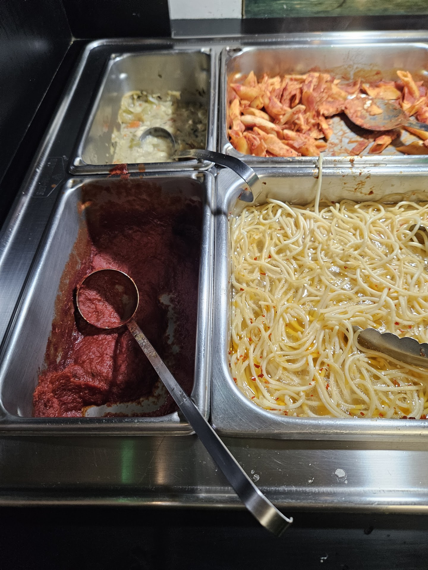 Read more530pm. Got the buffet, first time here. Buffet ends at 11pm. Plates, bowls and silverware dirty at buffet, had to pick through them to find a clean plate. Food is old, been out for hours. Was told at check out that it was going to be "freshened up". Spaghetti is floating in red pepper flakes and dry noodles on top. Pizza, Stromboli, and doughnuts hard as rocks. Soup is dried over on top. Nothing freshened up since it was put out at 11am. No meatballs in sauce. Cold bar was just as bad. Don't bother. I left there feeling robbed for what I paid for. Dirty tables with old food on 3-4 different tables. If their buffet looks like this...I am scared for what the kitchen holds. Pictures seriously look better then what...