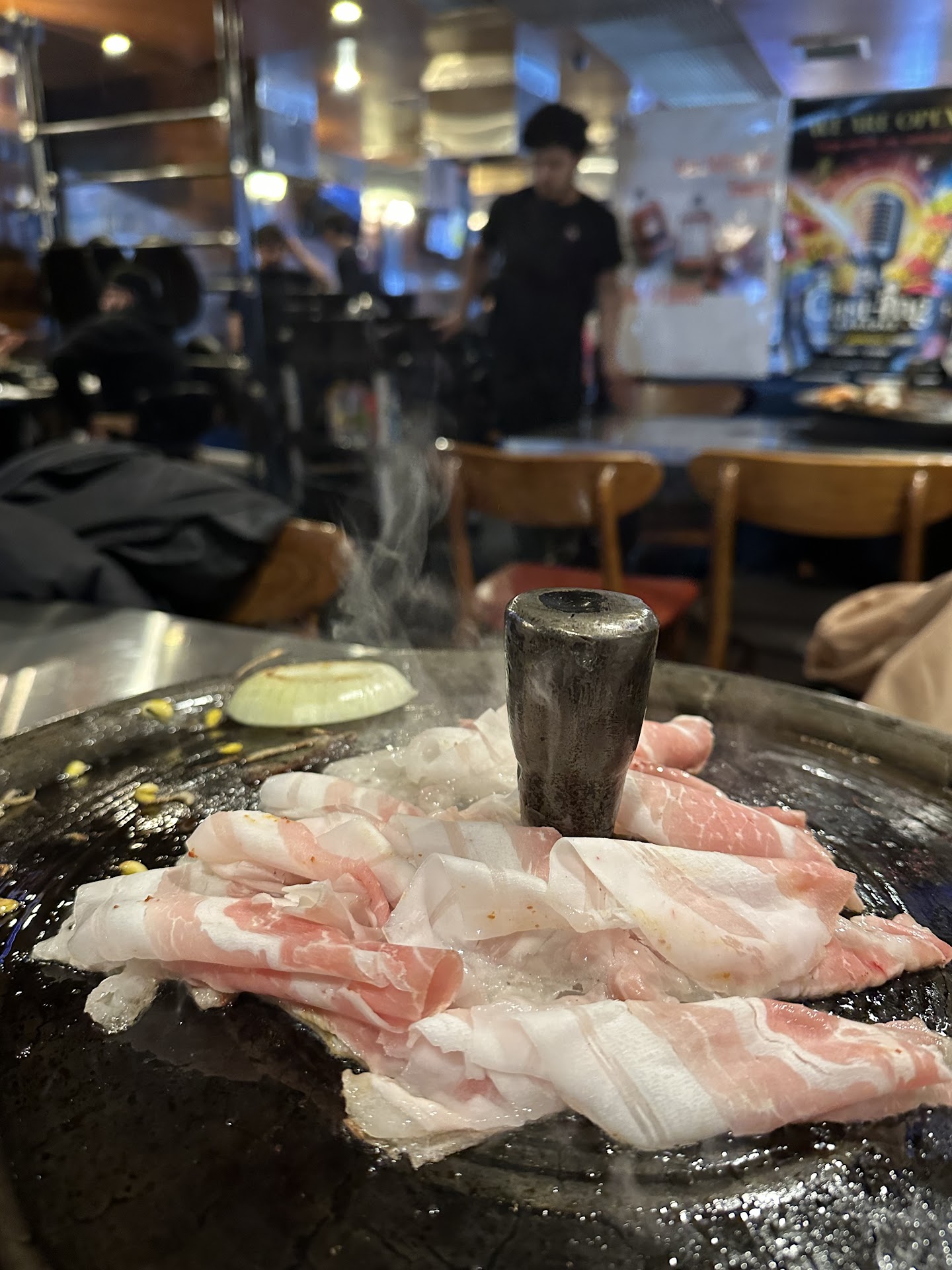 The drinks were delicious, but that was the only selling point. The menu had about 8-10 meat options (and that's overall--including all beef, chicken, seafood options), no sign of add-ons like vegetables (I had to ask), and I believe none of them were pre-seasoned or marinated. Truly, I was baffled. I've been to KBBQ's that have their raw meats at least seasoned or marinated; minimal sauces and not-salt mixed with pepper can only bring so much flavor. We ordered one of the beef dishes and I was concerned about what the butcher did to the poor meat. Consistency and precision of the cuts were not a priority; I saw the meat as a hack-job. With such inconsistent sizing of beef "chunks," the meat did not cook evenly together, so we had to wait for some pieces to cook more than others.