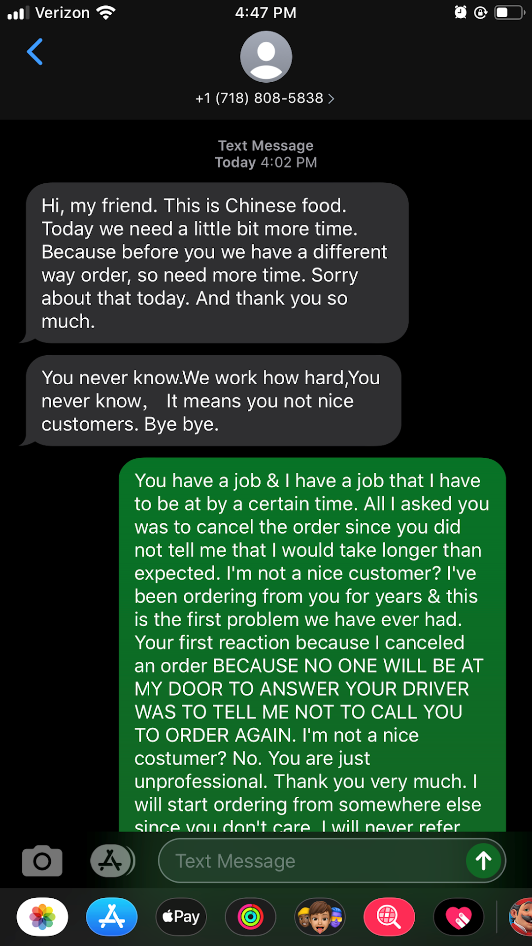 She then proceeded to text message me and tell me that I am not a nice customer along with some other words. I have attached the text conversation between me and the owner to this post because of HOW RUDE this woman was. I was waiting for food for MYSELF and MY YOUNGER SIBLINGS before I left for work. She told me I wasted her food, time, and money even tho I was the one who wasted my time and money and food that I was trying to feed my siblings.