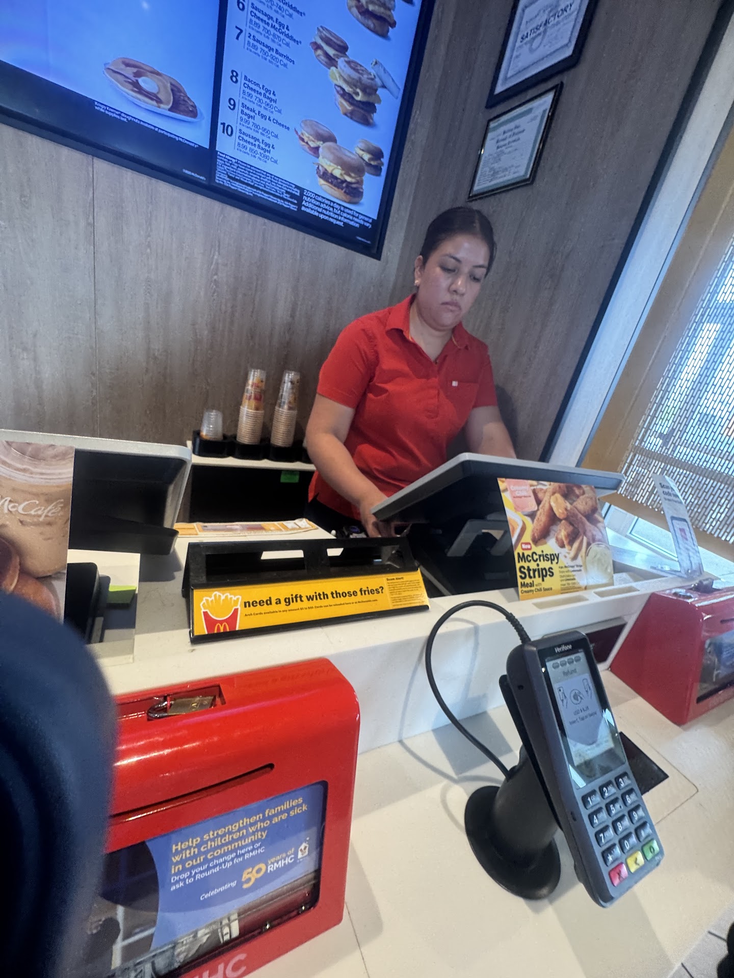 Read moreOrdered 2 mcchicken, 1 mcdouble, 2 L coffee, L fries && 6 pc chicken nugget via kiosk machine. The machine itself seems to lag when we input our orders but much faster than ordering from counter.
