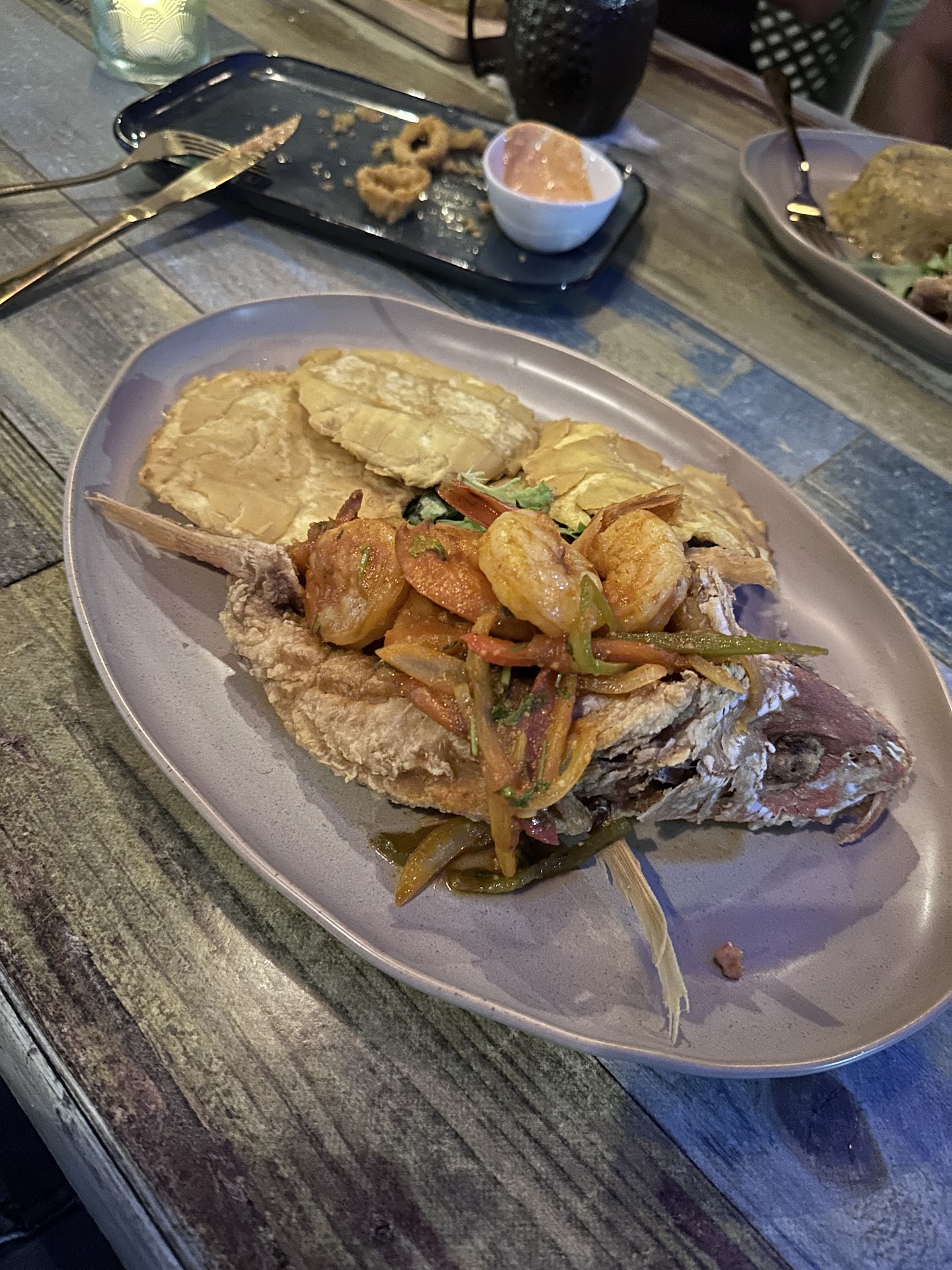 Our appetizers arrived shortly after, but we had to ask for plates. As we slid one of the appetizer plates full of food down the table, a cockroach crawled out from underneath it. It scurried across the table, then flung itself onto the bench between my husband and me before disappearing between the cushion and the bench.