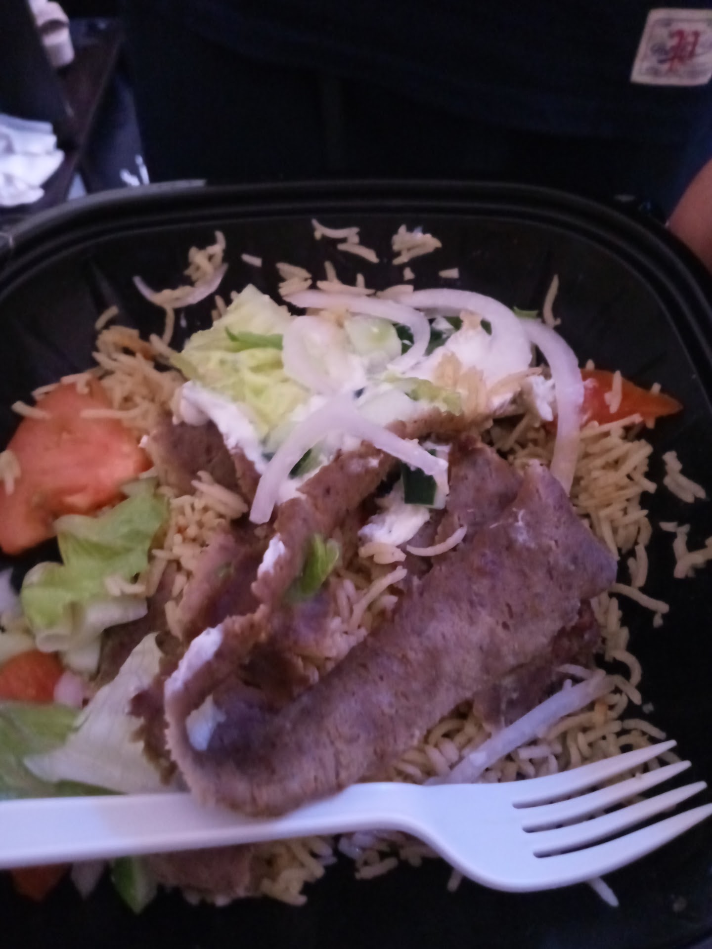My meal was spicy gyro and a small Greek salad. The salad appeared to be bulk made and I didnt feel like finishing it. The gyro did not seem spicy. When I asked, it seems the sauce is a spicy feta sauce instead of traditional tzatziki. It was thicker, creamier, than tzatziki, but it didnt seem spicy.