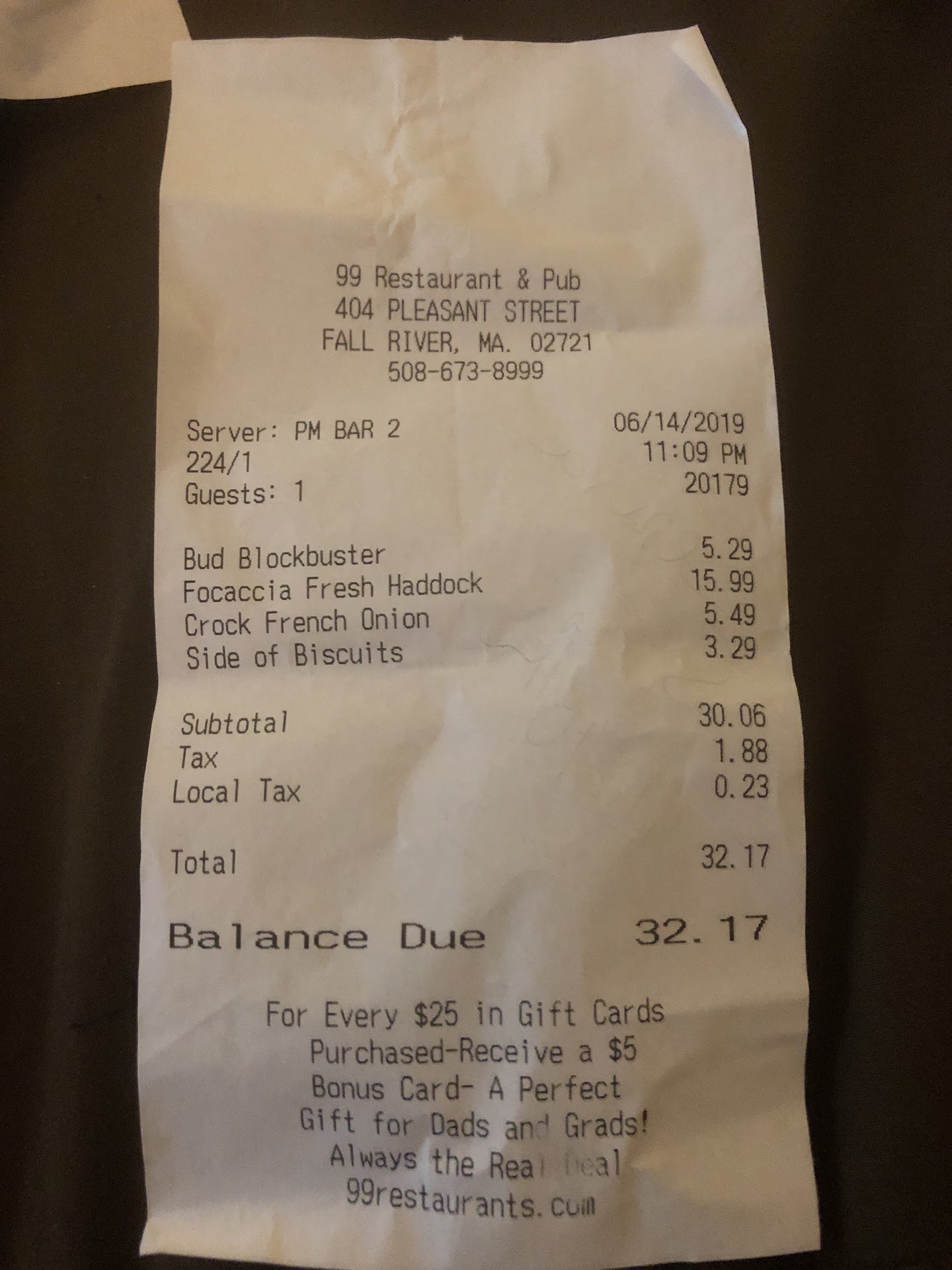 Read moreFall River 99 Restaurant USA hit or miss type of place. If you are not a Regular here I recommend sitting at a table rather than the bar. The bartender only seems to jump for the people she knows. Being at there beck and call. Me being a first timer here wasn’t impressive at all. I went to watch the Bruins Game here and sorry I did. It wasn’t busy being most people had left when I arrived and should have took this as a sign. She greeted me when I first sat down and asked what I was drinking? I ordered a Bud on tap, after waiting for a good ten minutes and still no drink I waited for her to come by and asked if I could get my drink now? She poured it and brought it over while asking if I would like to order any food? I decided on the Fresh Cod Special and waited on it. Sure enough time went on and I pretty much gave up on waiting. Just as I asked for the check she brought over my plate and asked if I was ok! I told her I was a little disappointed having to wait for my drink now my food she told me she had to take care of her regulars because that’s how she makes her living? Shocked as I was I just ate my food. I asked if they had bread? She told me they only have honey glazed biscuits, once again I hesitated ordering but did. Just as I was almost finished eating my biscuits arrived Hard, Cold and disappointed again I just asked for the check and left. I will not be eating at this place for a long time to come. The sad part is I go to the one in North Dartmouth, Mass and never had a bad experience like this location in Fall River, Mass. My advice is if you are in the mood for 99 Restaurants drive to the North Dartmouth, Mass location where you are sure to be greeted and treated as a customer should be no matter...