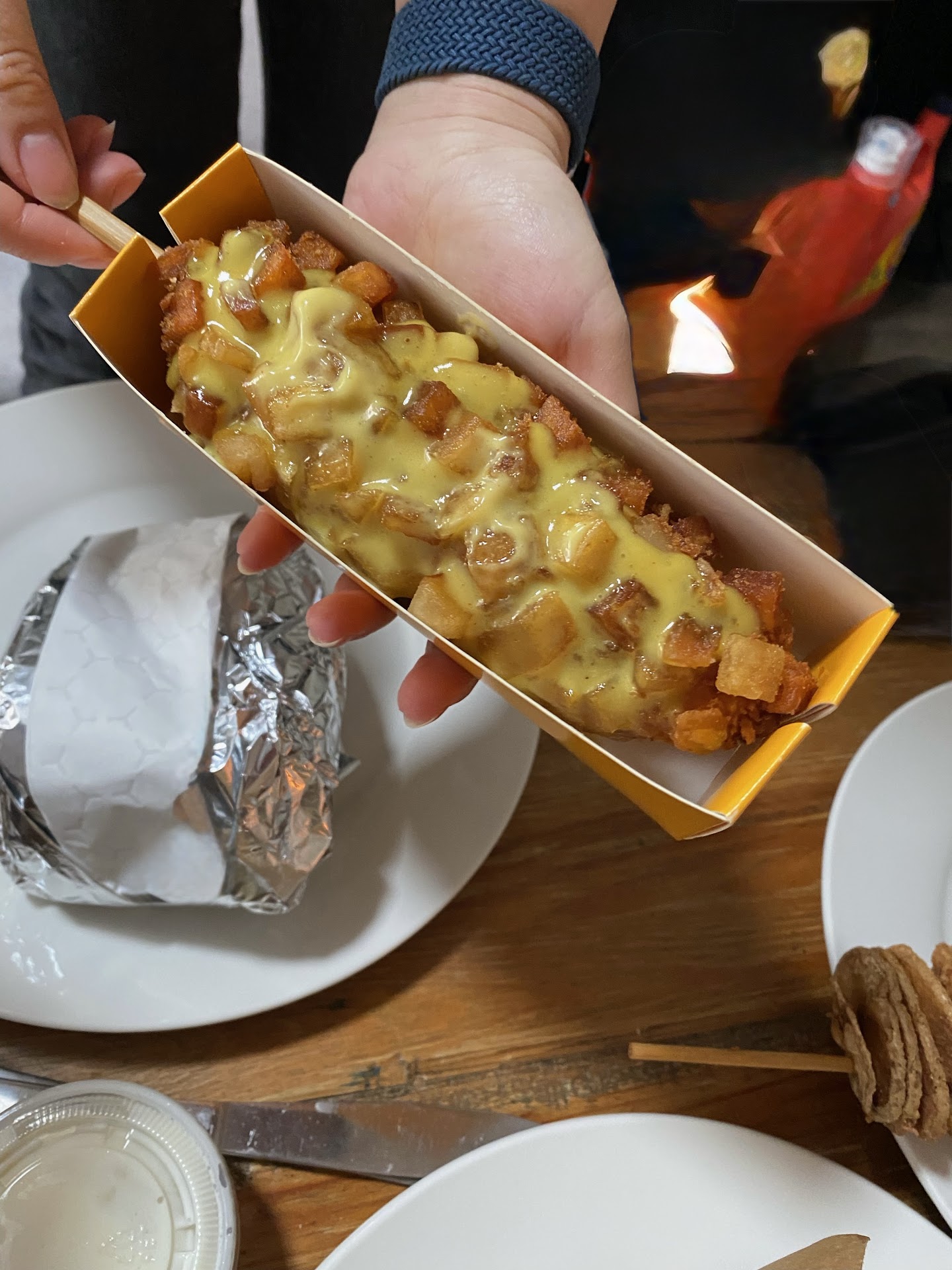 First time trying and it was not disappointing. Staff there are so friendly and nice. We got one each of.. original, potato, ramen, cheeto and dorito. I wasnt expecting half cheese on top then the dog on the bottom but they were still good. Great cheese pull! Personally wasnt a fan of the tornado potato flavor but the crispy ness was just right. The fried chicken with the garlic sauce was soooo good. The bbq is different. I keep tasting not sure how to feel but its good. My husband is so confused about the sweet mayo but loved it (hes the condiment king) cant wait to come back and...